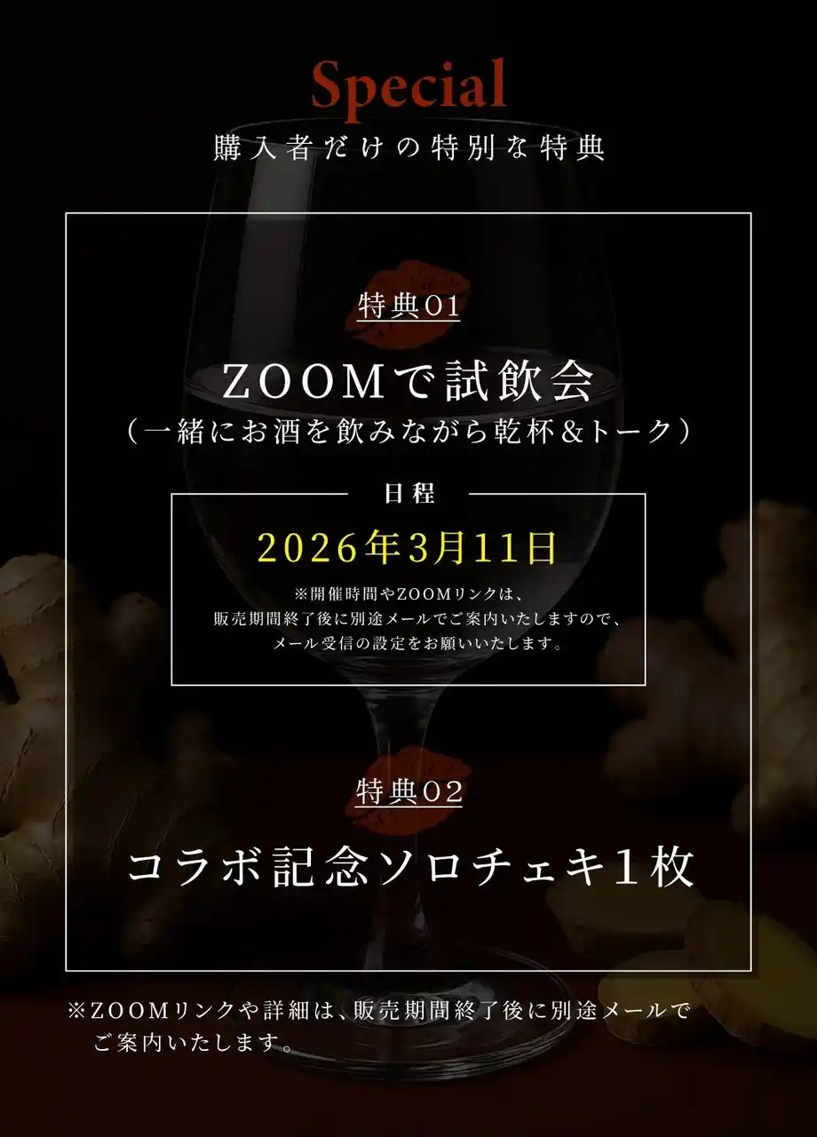 また、購入者特典としてZoom試飲会の開催を予定しています。開催前日にメールで参加リンクを共有しますので、メール受信設定をご確認ください。 |