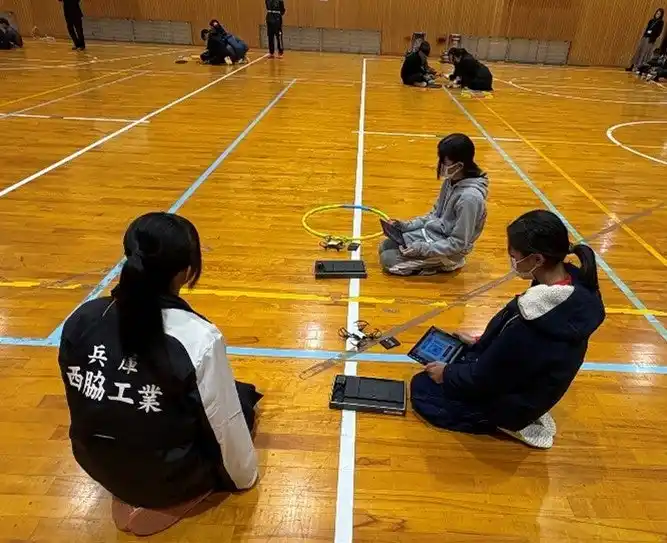 本校生が地域の小学生と交流。教育用ドローンとタブレットを使用して、ドローンの動きをプログラミングで制御し、順次処理や繰り返し処理など、学んだことを教えました。 |