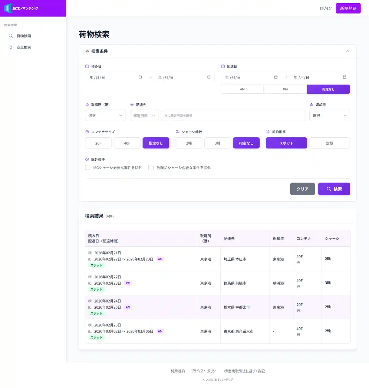 海コンマッチングの検索画面と検索結果 |