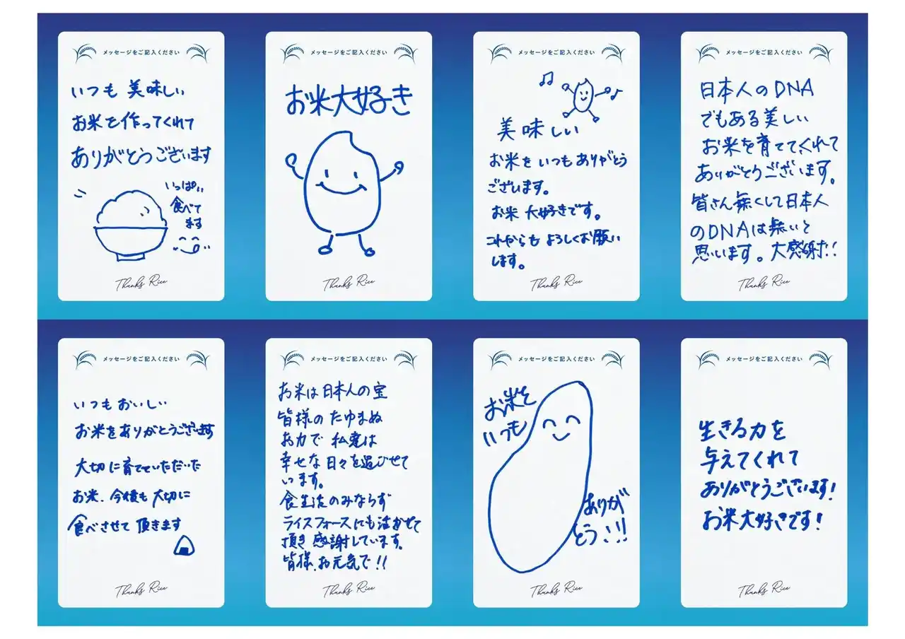 「Thanks Rice」公開に込めた想い ライスフォースは、これらの声こそが、25年間にわたり米とともに歩んできたブランドの歩みを映し出すものであり、同時に「米農家の皆さま」と「お米の恵みと生きる皆さま」をつなぐ大切な記録であると考えています。本ページでは、イベントで集まった来場者による直筆メッセージを通じて、米を育てる人々への感謝の声を紹介しています。 |