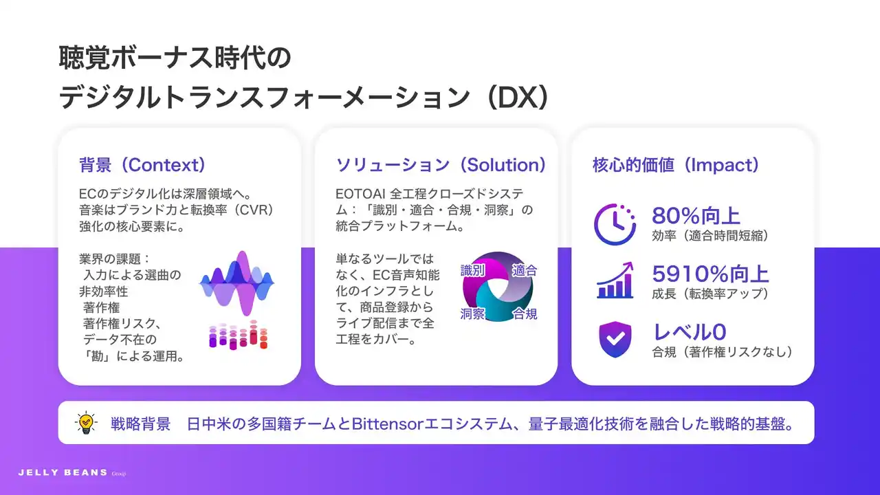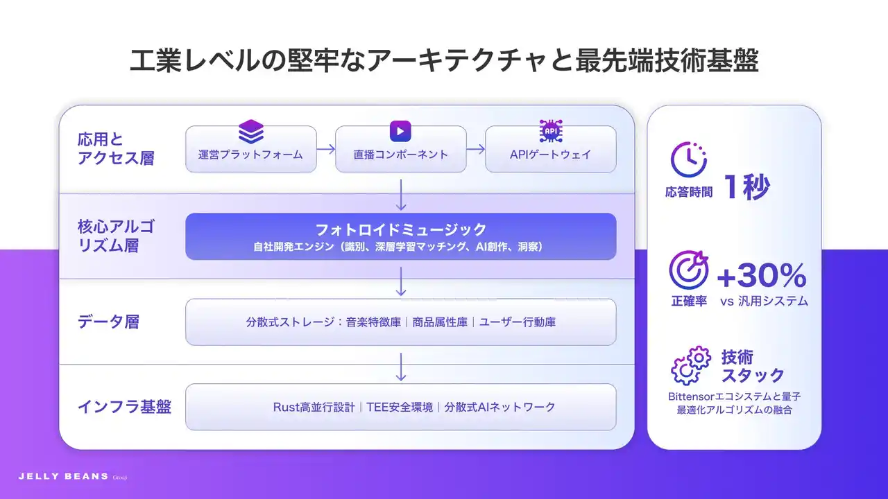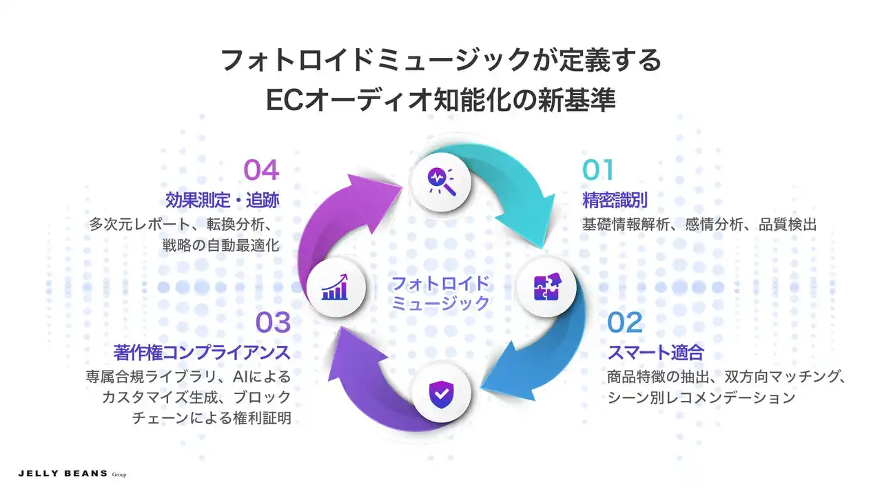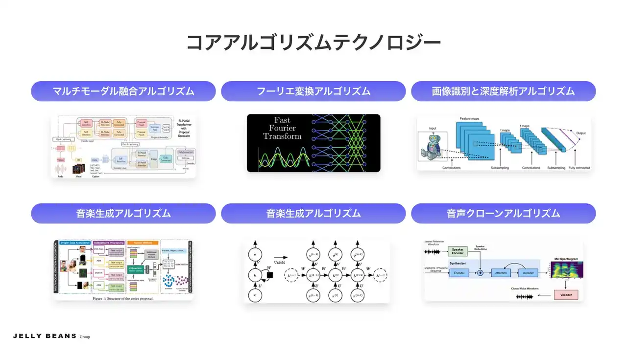 写真、テキスト、動画等の入力データから、AIが瞬時に感情や背景を解析し、専門知識を必要とせずに高品質なオリジナル楽曲を生成します。日本語、英語、中国語を含む多言語に対応し、グローバルな展開を視野に入れています。 |