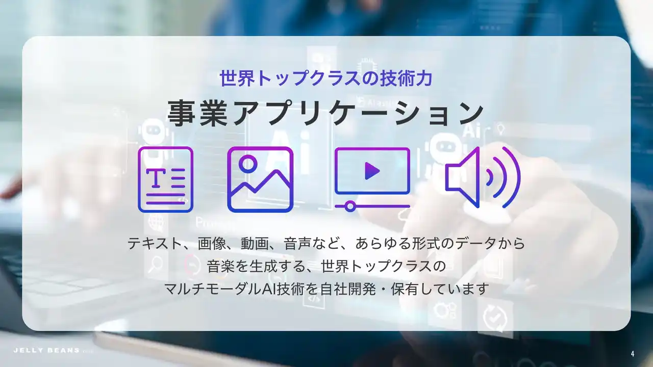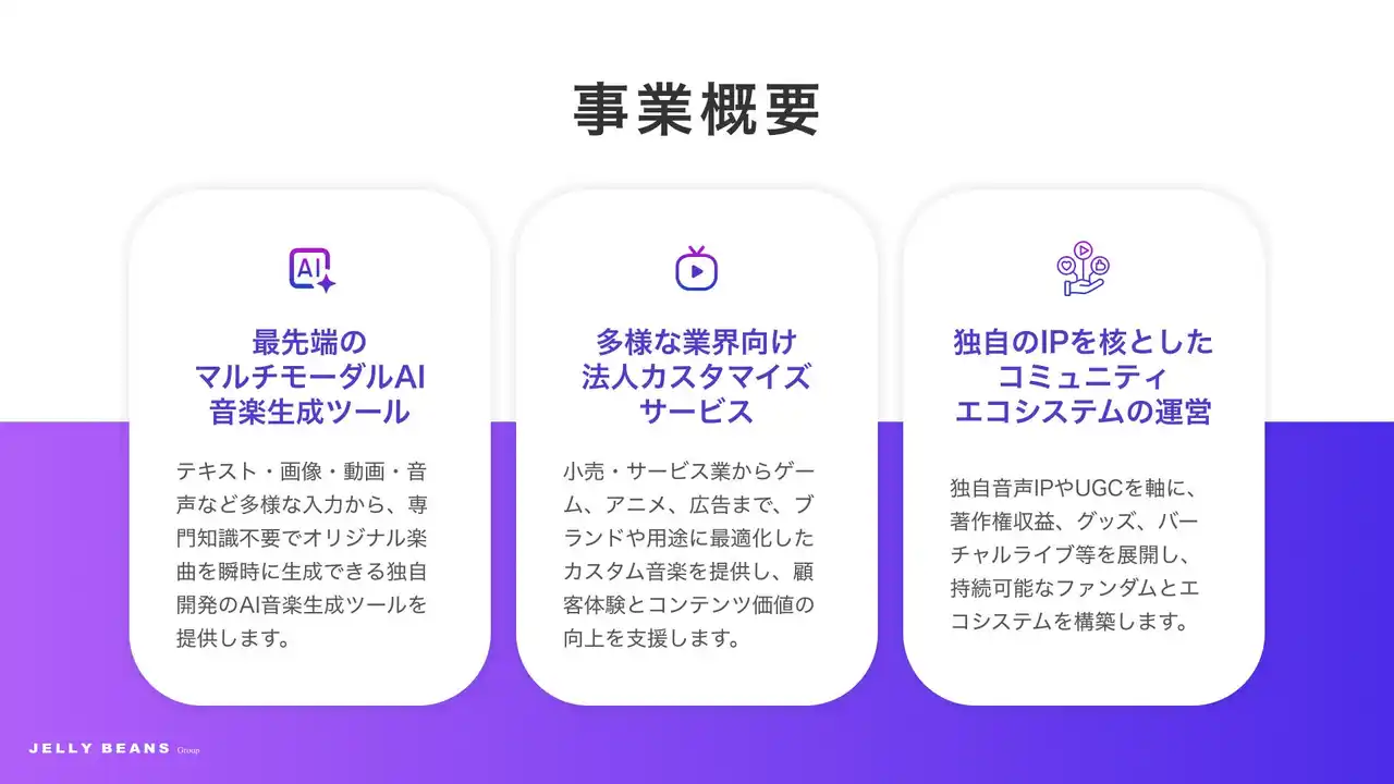 当社は、先端技術を活用した新規事業の創出に注力しております 。今般、独自のマルチモーダルAI技術を活用し、写真やテキストから手軽にオリジナル楽曲を生成できる音楽制作サービス「フォトロイドミュージック」を展開することで、UGC(ユーザー生成コンテンツ)市場への参入および新たな収益基盤の構築を目指します。 |