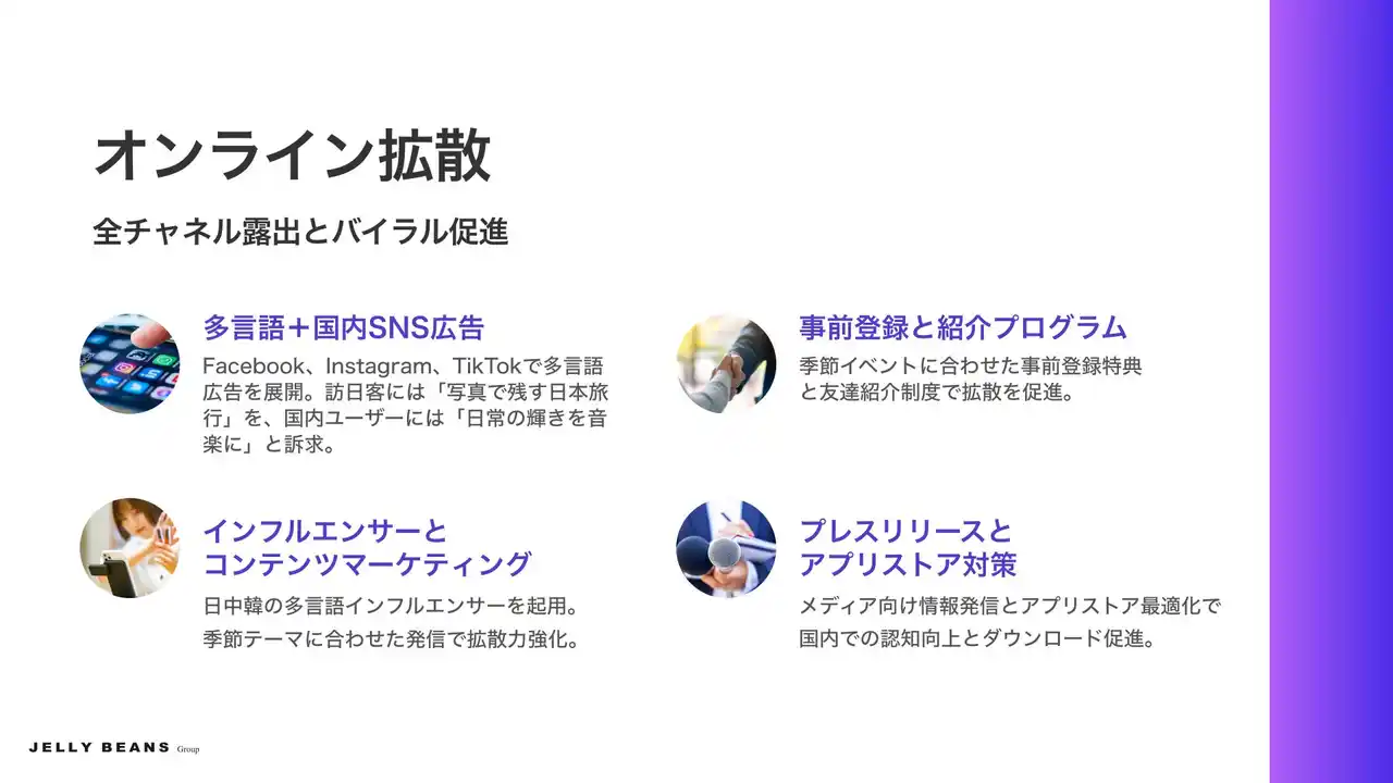 ドラえもん、ポケモン、ジブリなど人気IPと提携し、限定素材ライブラリを提供。インフルエンサーによる実際の使用シーンを発信。 |