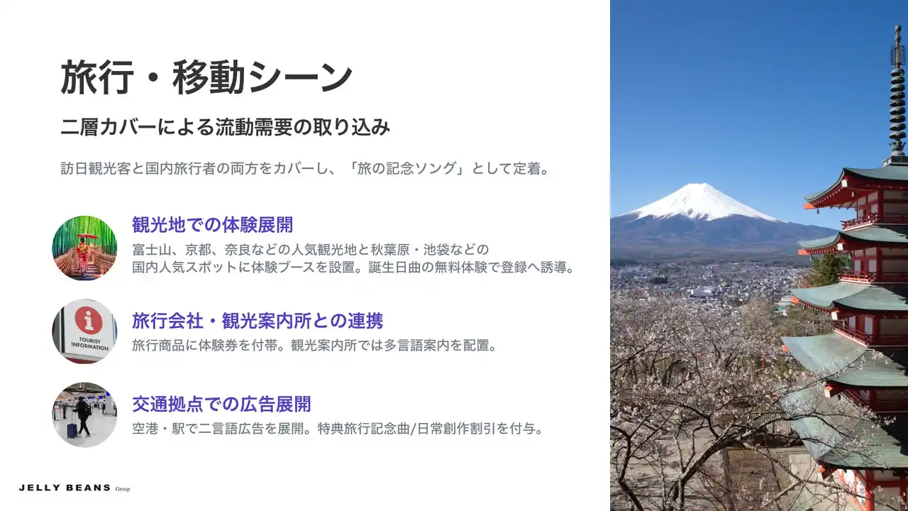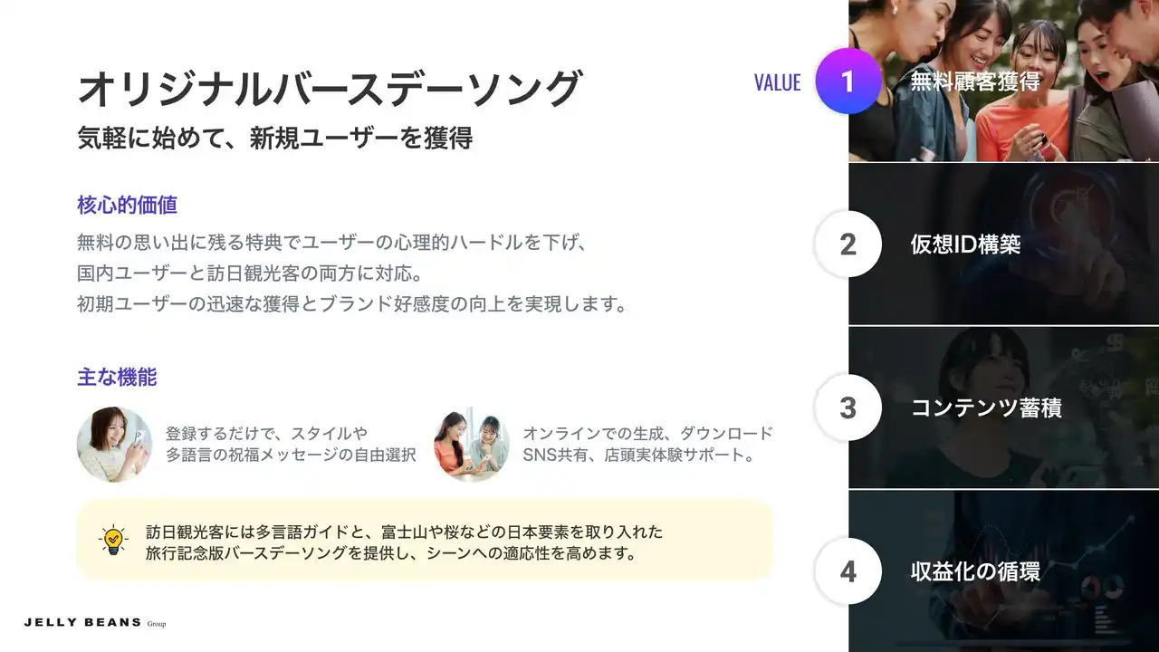 コンビニ・商業施設・コミュニティセンターに体験コーナーを設置。食事記録、家族団らん、記念日など日常シーンで楽曲生成サービスを提供。QRコード読み取りで登録後は誕生日曲の無料カスタマイズ権を付与。 |