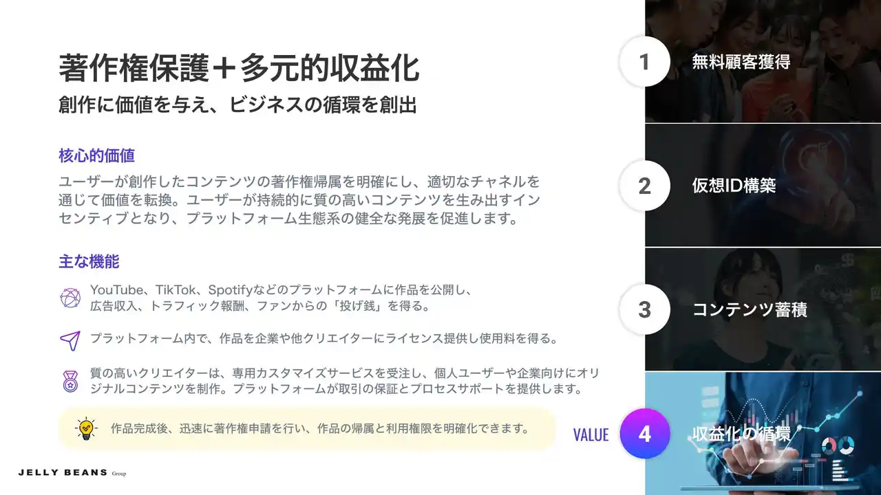 フォトロイドミュージックが日本市場向けに構築したモデルは、ユーザーのライフサイクル全体のニーズを核心に据え「無料顧客獲得 - 仮想ID構築 - コンテンツ蓄積 - 収益化の循環」という完全な連鎖を構築しています。 |