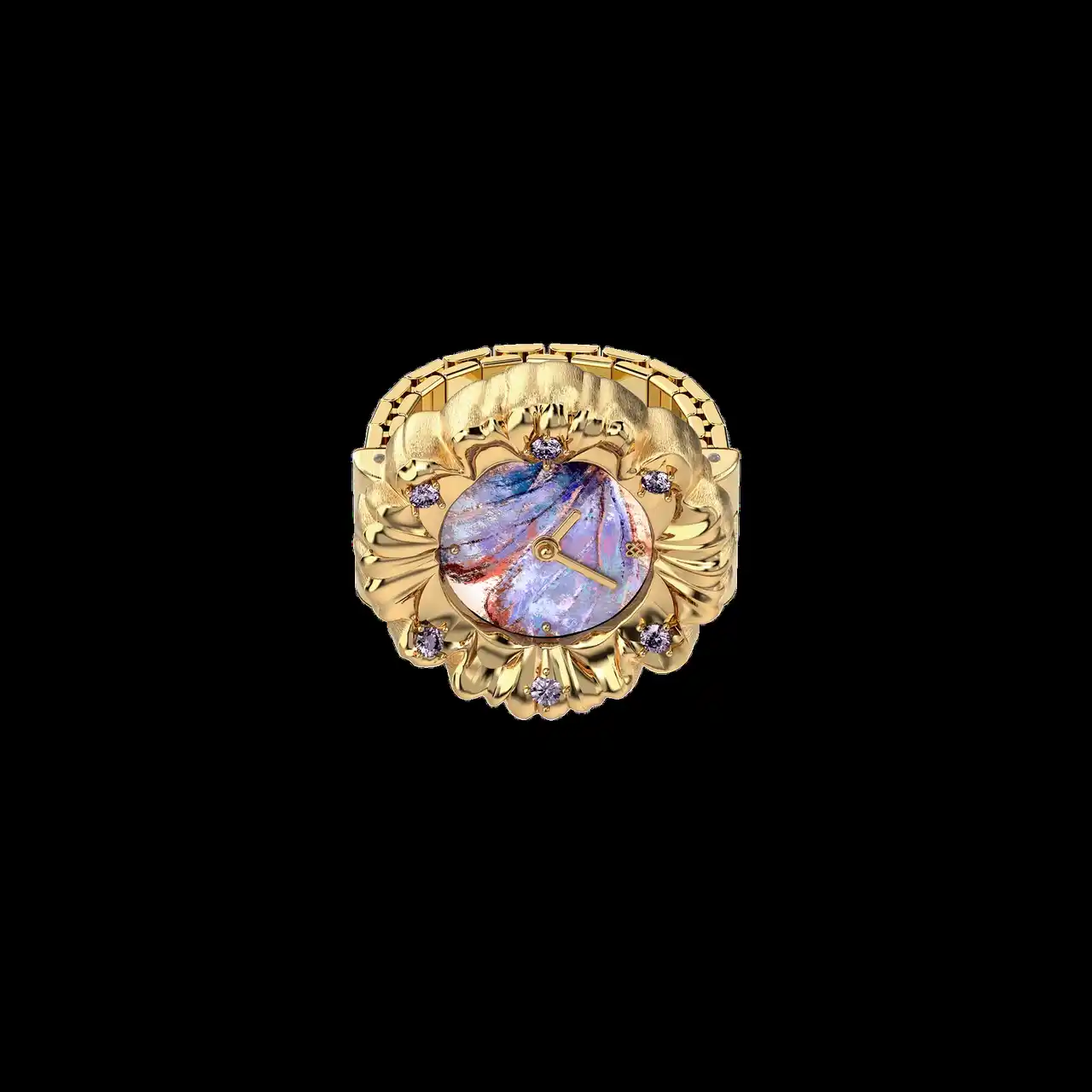 | Mauveモデルの文字盤には、オイルペインティング調で描かれた蝶のモチーフを採用。絵画のような繊細なタッチで表現されたデザインを、ダイアルの中に落とし込んでいます。 | |||||||||