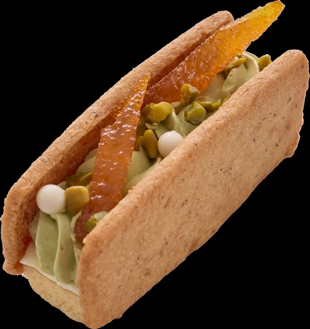 ジェノワーズ生地に爽やかなオレンジと、コクのあるピスタチオの2種類のバタークリームとオレンジの砂糖漬けを重ね、ヘーゼルナッツに芳醇な香りのしっとりサブレでサンドしました。 |