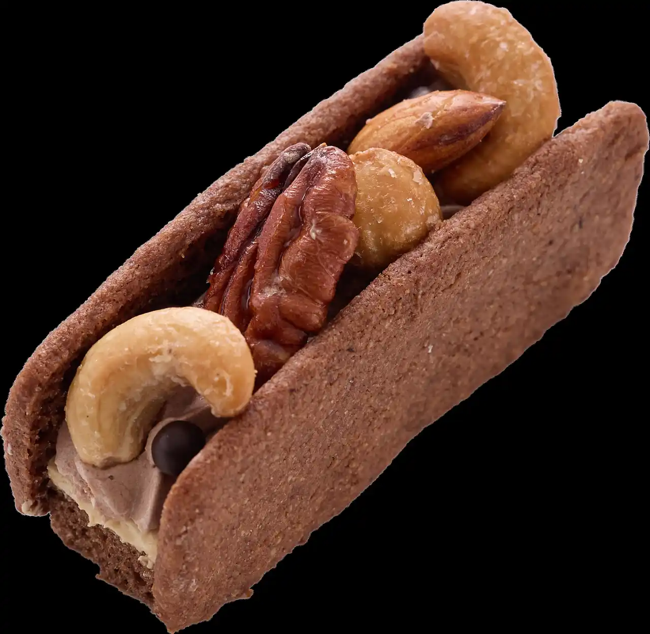ココアジェノワーズ生地に2種類のバタークリーム、香ばしいカリっと食感の3種のナッツを重ねヘーゼルナッツの芳醇な香りとココアの甘さのしっとりサブレでサンドしました。 |
