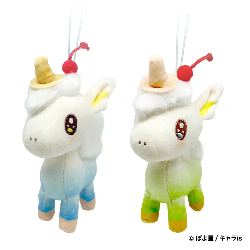 ふわふわなしっぽがかわいい(ハート)頭のソフトクリーム、コーン、チェリーがチャームポイントの「メロコーン」がぬいぐるみマスコットになって、当社限定でプライズ化!メロンソーダとブルーソーダの全2種を展開いたします。 |