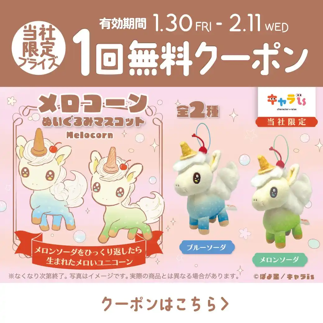 株式会社イオンファンタジー(本社:千葉県千葉市、代表取締役社長:藤原徳也、以下、当社)は、当社が運営するオリジナルキャラクター特化型プラットフォーム「キャラ is」(URL: https://charaise.jp/)から生まれたキャラクター「メロコーン」のプライズゲーム用景品「メロコーン ぬいぐるみマスコット」を、1月30日(金)より当社限定でアミューズメント施設「モーリーファンタジー」「PALO」、オンラインクレーンゲーム「モーリーオンライン」等において順次展開いたします。 |