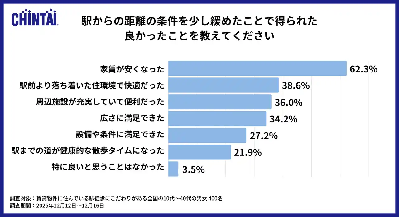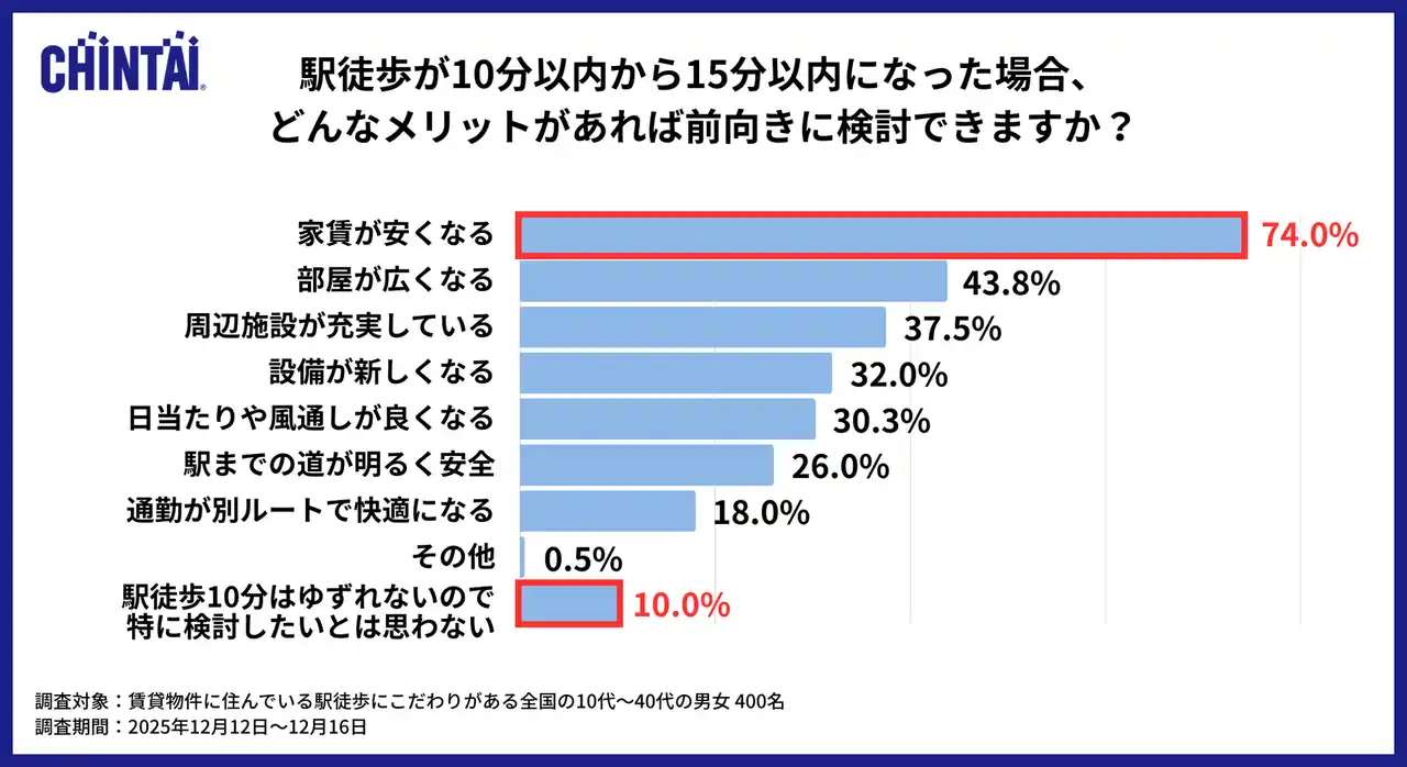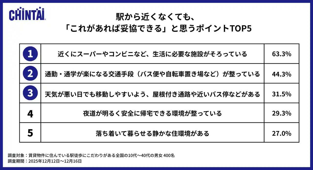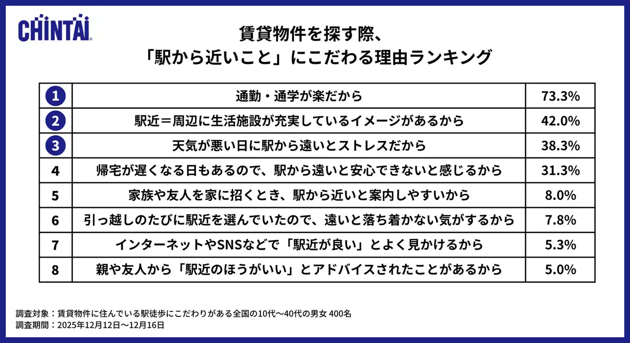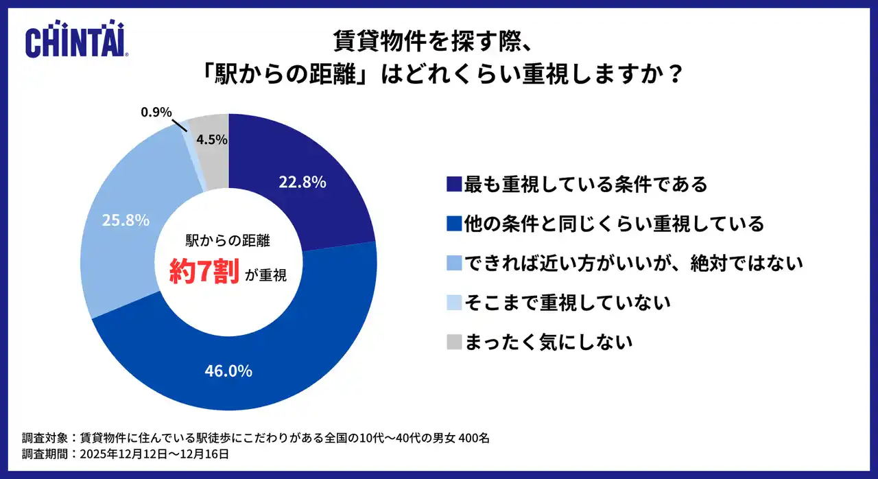そこでCHINTAIでは、賃貸物件探しにおける「駅からの距離」や「築年数」に対する意識の実態や、その背景にある考え方を明らかにするため、本調査を実施しました。 |