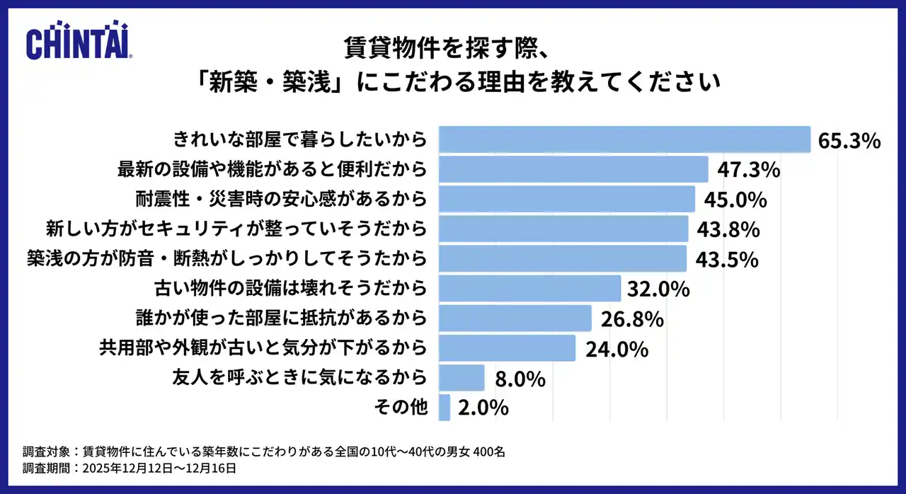 賃貸物件を探す際に「新築・築浅」にこだわる理由では、「きれいな部屋で暮らしたいから」が65.3%で最も多くなりました。次いで、「最新の設備や機能があると便利だから」(47.3%)、「耐震性・災害時の安心感があるから」(45.0%)、「新しい方が、セキュリティが整っていそうだから」(43.8%)が続いています。また、「築浅の方が防音・断熱がしっかりしていそうだから」も43.5%と、設備面や安全面に関する理由が上位に並びました。 |