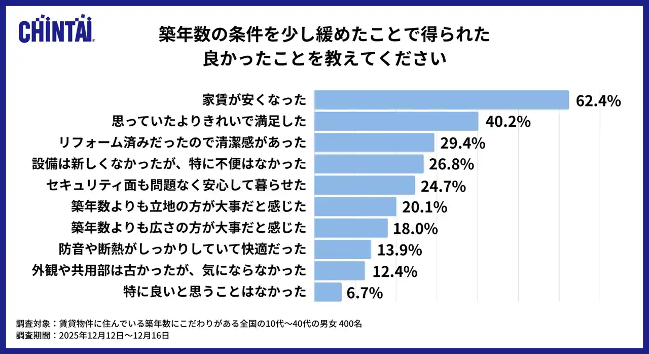 ・実際に築年数を緩めてうれしかった点では、「家賃が安くなった」が6割超となりました。 |