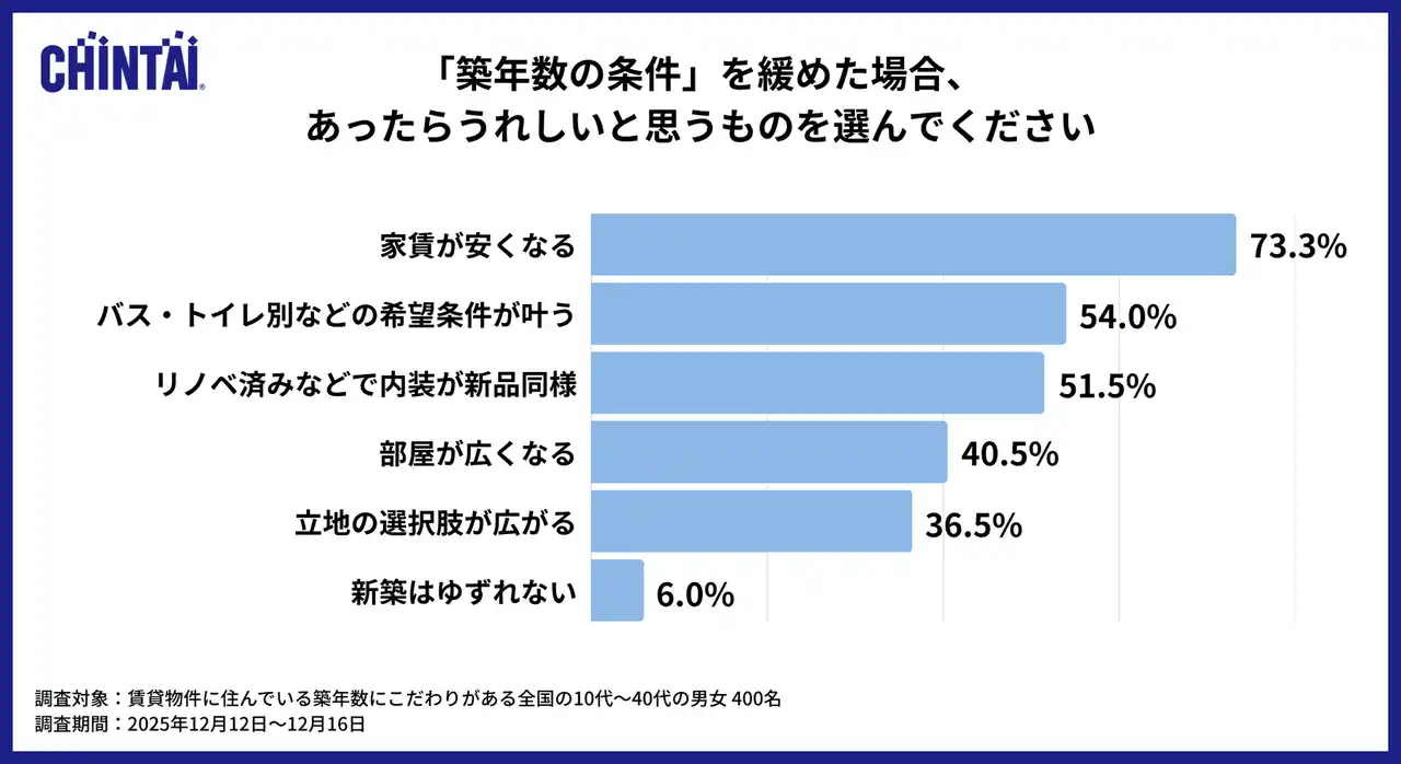 築年数の条件を緩めた場合に「あったらうれしいもの」では、「家賃が安くなる」が73.3%で最も多くなりました。次いで、「バス・トイレ別などの希望条件が叶う」が54.0%、「リノベ済みなどで内装が新品同様」が51.5%と続いています。一方で、「新築はゆずれない」と回答した人は6.0%にとどまりました。築年数の条件については、家賃や内装などの条件が整えば、多くの人が柔軟に検討していることがうかがえます。 |