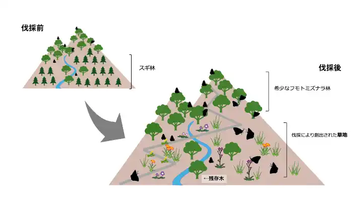 民間企業が行う商業的な林業(伐採再造林)において、伐採前の作業道設計から植林・草地管理まで、特定のチョウ類の「保全」だけでなく「再生(生息環境を増やす)」を目的に、林業の全工程へ具体的措置を組み込んだ取り組みは国内で例がなく、特に保持林業と呼ばれる伐採区域内の広葉樹を保残しながら取り組んだ事例としては、本プロジェクトが日本初の試みとなります。 |