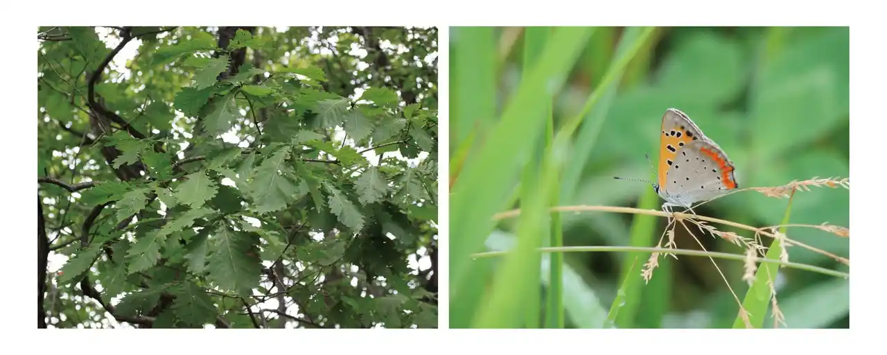 自生するフモトミズナラ、調査時に発見されたベニシジミ |