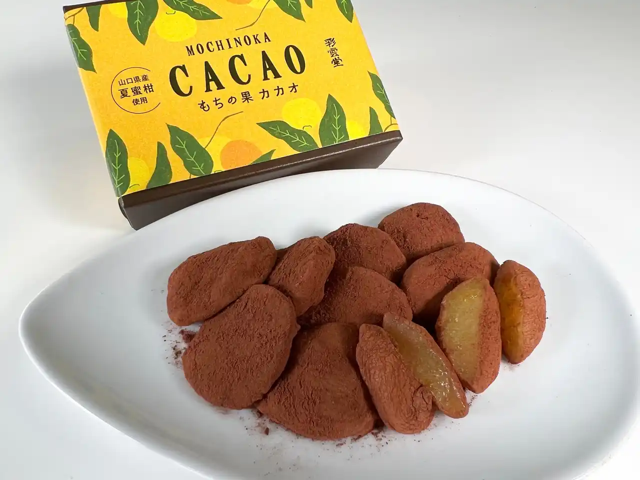 | その定番の「もちの果 夏蜜柑」に、ココアをふんわりとまとわせたのが、「もちの果 cacao」です。柑橘の爽やかさとカカオのほろ苦さが重なり、バレンタインらしい余韻を楽しめる一品に仕上げました。 | ||||||||||||||||