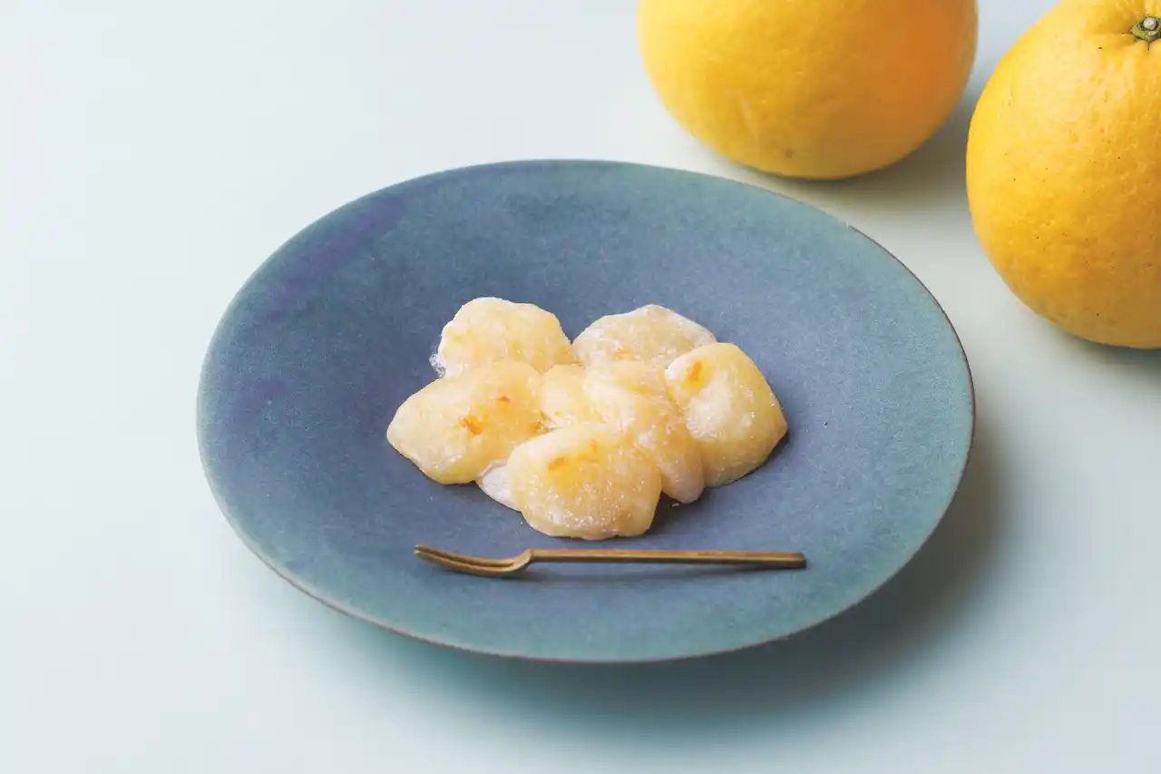 「もちの果」。 山口県を中心にスーパーマーケットを展開する株式会社丸久との共同開発で生まれ、夏蜜柑の果皮を |