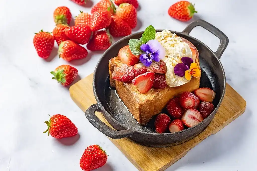 フレッシュないちご「紅ほっぺ」を贅沢に使用した、今だけの季節限定フレンチトーストです。主役となる紅ほっぺは、バニラの香りをまとわせた特製シロップで軽くマリネ。いちご本来の甘みとほどよい酸味を引き立て、ひと口目から華やかな香りが広がります。 |
