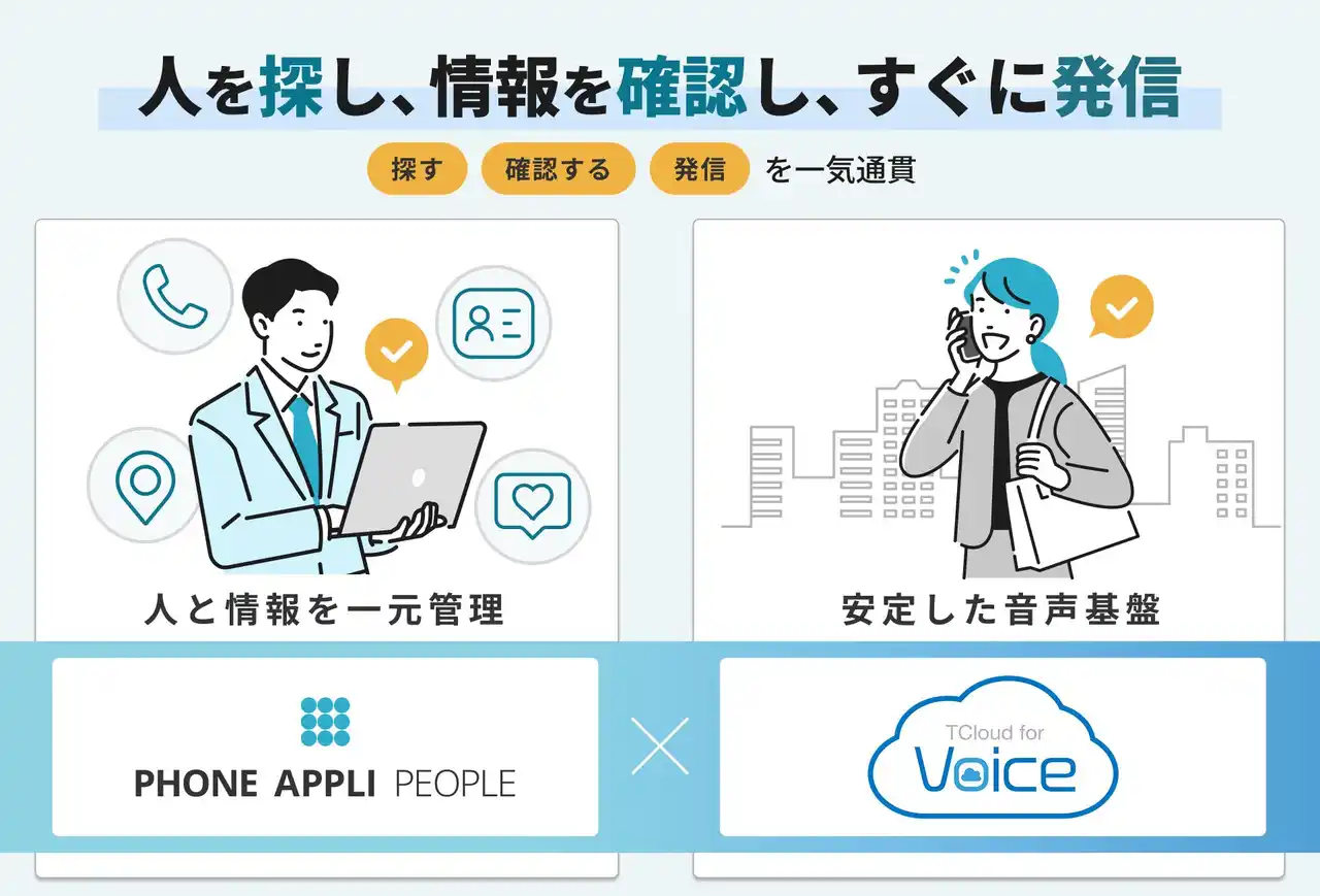 本サービスは、同社が提供するクラウドPBXサービス「TCloud for Voice」に、当社のクラウド電話帳・社内コミュニケーションポータル「PHONE APPLI PEOPLE」(以下、PA PEOPLE)を標準機能としてバンドルすることで、音声と非音声サービスが統合され、ハイブリッドワークや多拠点環境におけるシームレスなコミュニケーション基盤の強化を実現します。 |