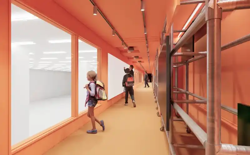 2階の工場見学通路は、まるで工場の裏側に潜入するような臨場感あふれる空間に刷新。 |
