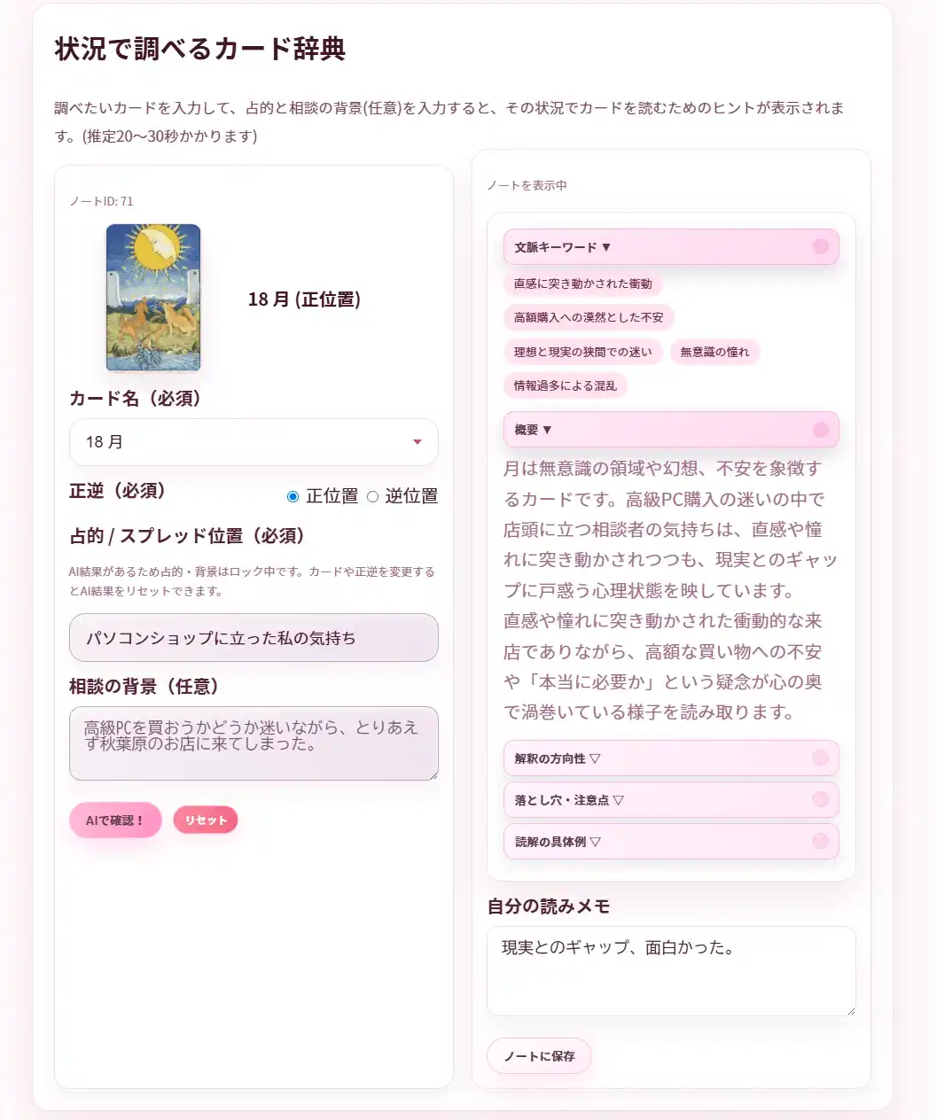 一般的なタロット辞典はカードの意味を一律に解説するが、本ツールの「カード辞典」機能は、相談内容や占的を入力することで、その状況に応じた読み解きのヒントをAIが生成する。同じカードでも文脈によって解釈が変わるというタロットの本質を、実践的に学べる設計となっている。 |