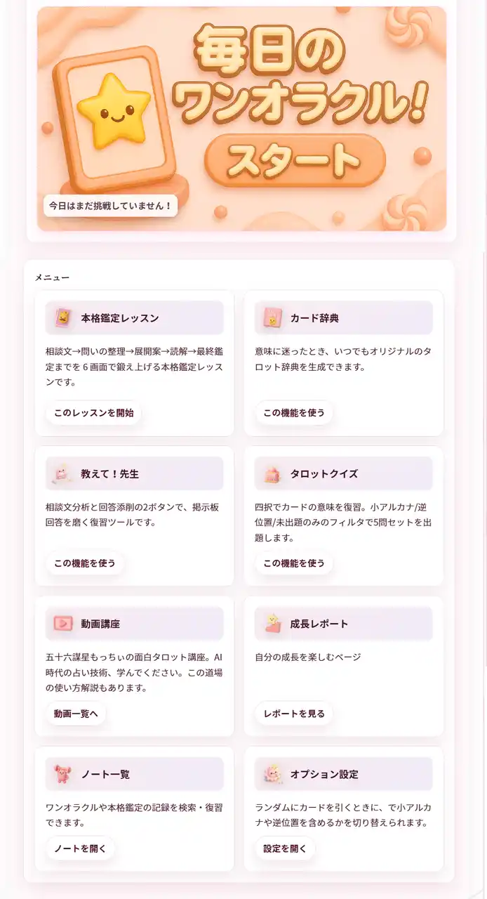 毎日のワンオラクル、学習カレンダー、成長レポートなど、継続的な学習を促す機能を搭載。タロットクイズ機能では、カードの意味を四択形式で復習することもできる。飽きずに楽しみながら占いを学ぶだけでなく、実際にプロになった後も鑑定力の向上のために使い続けることができるように機能を設計している。 |