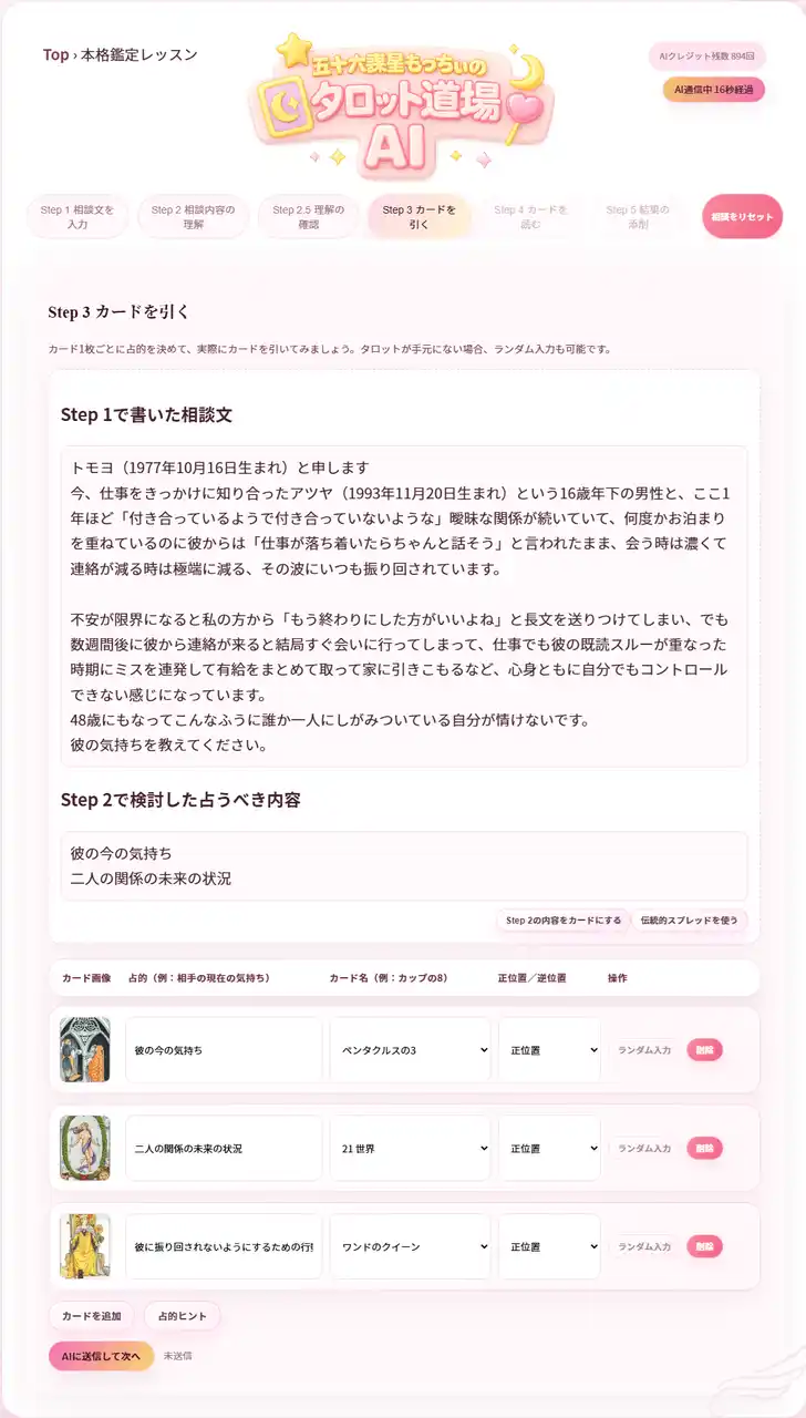 本ツールでは、プロ占い師がタロット鑑定を行う際の思考を、以下の5つのステップに分解して学ぶことができる。 |