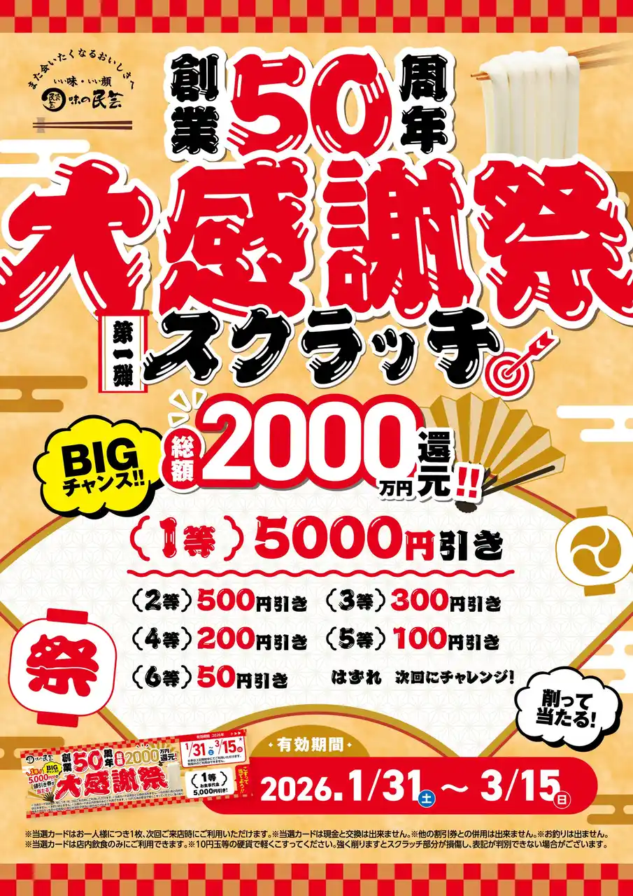 味の民芸フードサービス株式会社(本社:愛知県名古屋市守山区八剣二丁目118番地 代表取締役社長 榊原 晃)が運営する手延べうどんと和食の『味の民芸』は、2026年1月30日(金)をもちまして、創業50周年を迎えます。 |