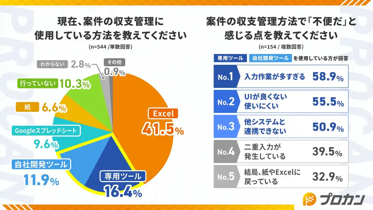 2025年10月1日に当社で発表した「案件収支管理の実態調査※」では、案件収支管理方法として「Excel」が最多という結果になりました。また、ツールを使用している企業でも半数以上が「入力作業の多さ」「使いにくいUI」「他システムとの連携不足」などとを不便に感じており、ツール導入だけでは十分な効率化につながっていない現状が明らかになっています。 |