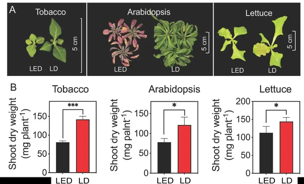 赤色LDは同等波長の赤色LEDよりも効率的な光合成をもたらす |