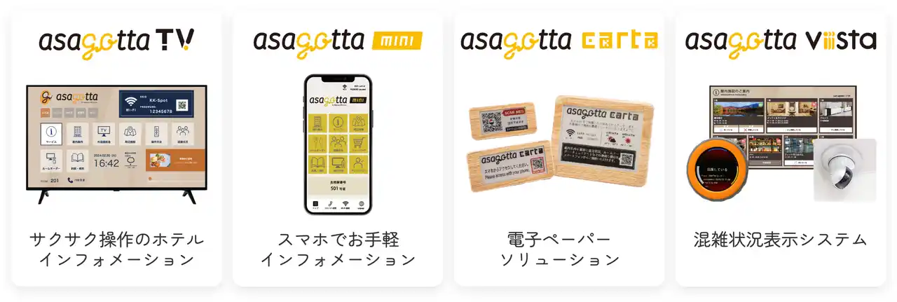 | asagottaシリーズは、「VODをやめたい」というホテルからのご相談を受けて開発した、客室TVシステム「asagotta TV」と、同システムから派生したホテル向け総合ITソリューションです。フロント問い合わせの削減、業務効率化、ペーパーレス、インバウンド対応など、ホテルには業務効率化とコスト削減を、ゲストには快適な宿泊体験を提供します。 | |||