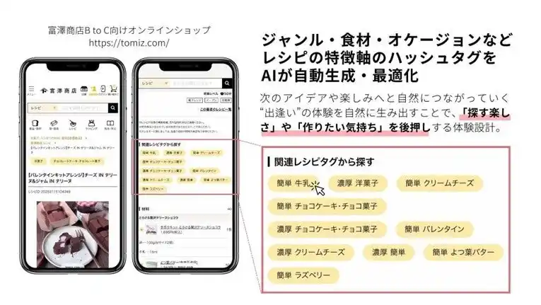 | 富澤商店のレシピコンテンツにおいては、レシピの内容や文脈を理解したうえで、関連性の高いキーワードやテーマを自動で抽出・可視化し、次のレシピや商品へと自然につながる導線を構築しています。 | ||||||||||||||||