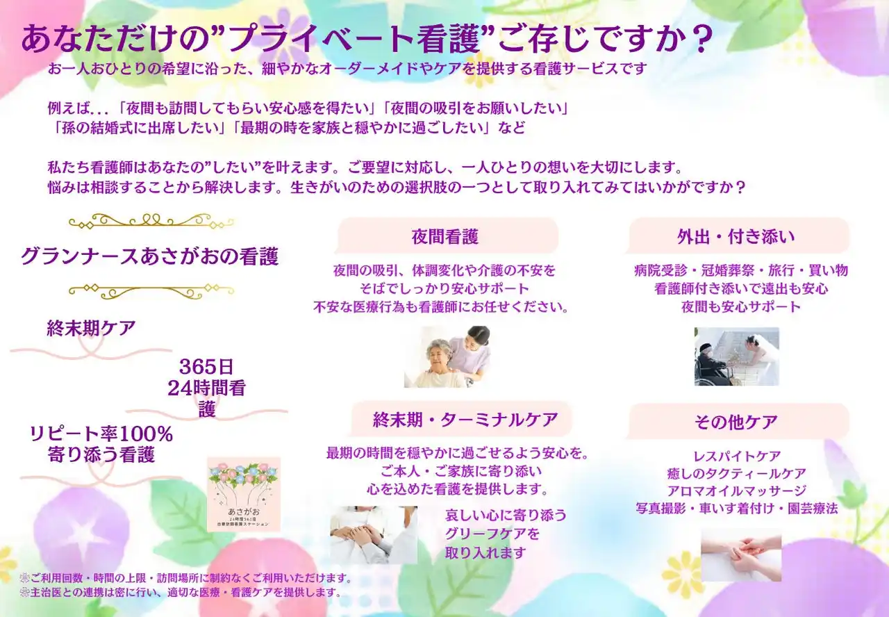 グランナースあさがお/Jgran株式会社 事業内容:自費・プライベート看護/コンシェルジュナース 対応エリア:東京都中心・近隣県 特徴:夜間・24時間対応/完全オーダーメイド看護 |