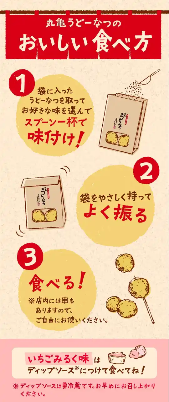 店頭で袋に入って販売している「丸亀うどーなつ」は素朴なプレーン味です。プレーン味には、店内にご用意しているアサイーベリー味パウダー、特製チョコレート味パウダー、きなこパウダー、きび糖パウダーの中からお好きな味をスプーンに1杯とり「丸亀うどーなつ」の袋の中へ入れたら、よく振ってお召し上がりください。「アサイーベリー味」のディップソースはレジでお渡しします。店内には、串のご用意もありますので、ご自由にお使いください。 |
