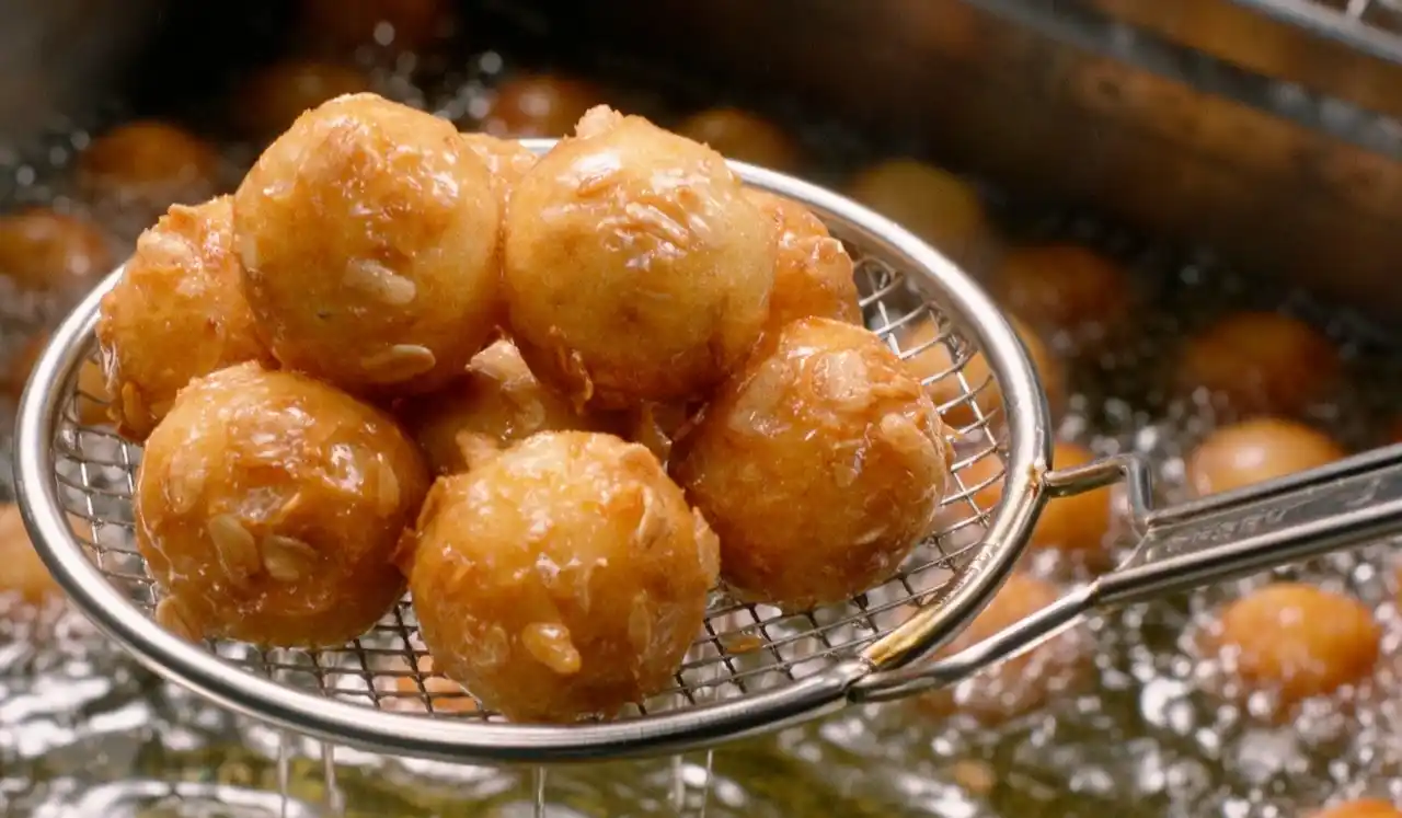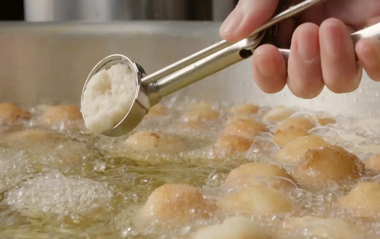 お店でうどんをミキサーにかけてペースト状に。数時間おきにひく白だしを生地に加えるのが丸亀製麺ならではのこだわり。旨みと香り高い風味をプラスします。もっちもち食感を生みだすために空気を含ませながらやさしく粉と混ぜ合わせ、生地を少し寝かせます。丸い形に整えて、ひとつずつ丁寧に揚げたらできあがり。手づくりならではの素朴なおいしさをお楽しみください。 |