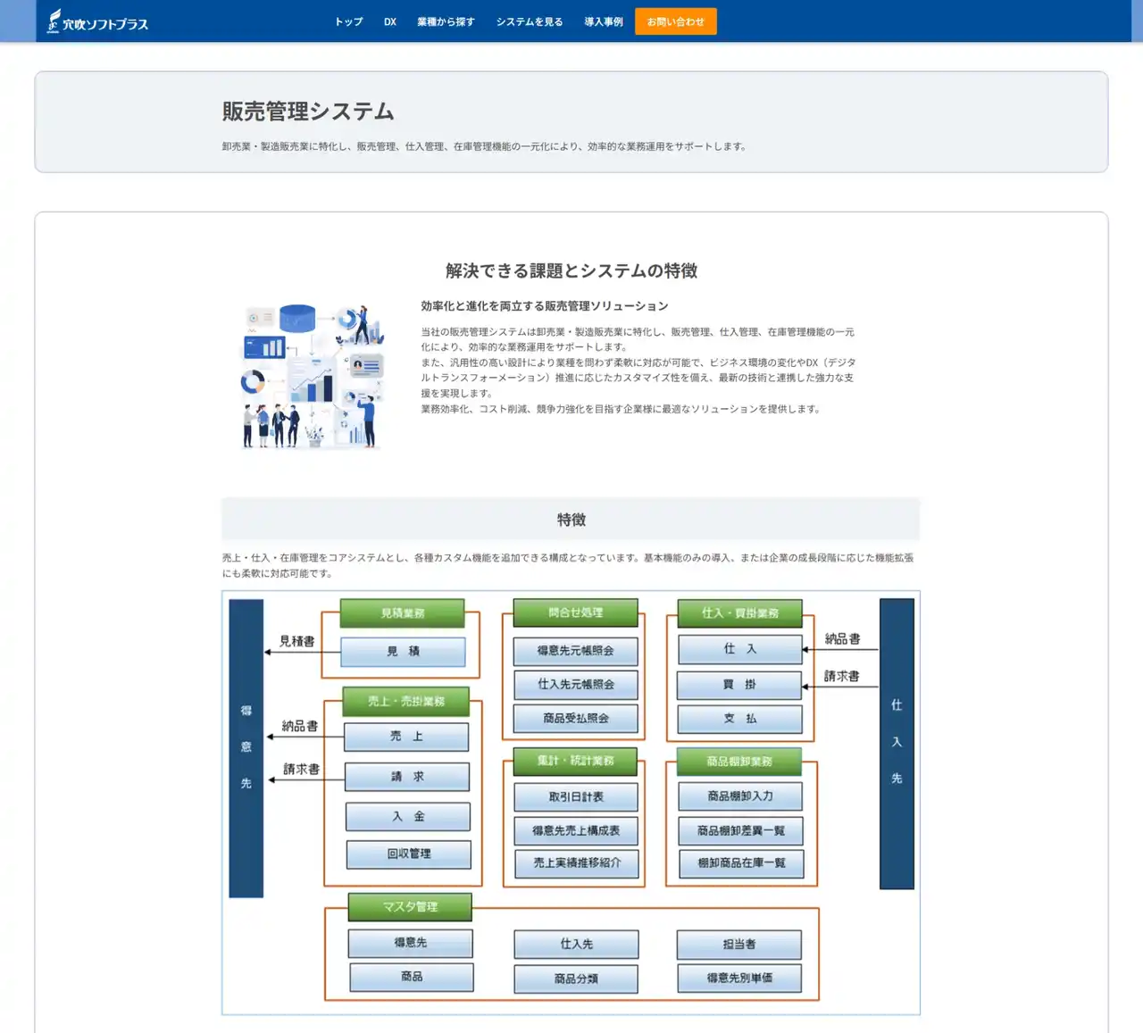 穴吹ソフトプラスは、こうした経営者様の悩みに寄り添い、IT導入によって「会社がどう変わるのか」を明確に伝えるため、サイト内のシステム開発コンテンツを全面リニューアルしました。 |