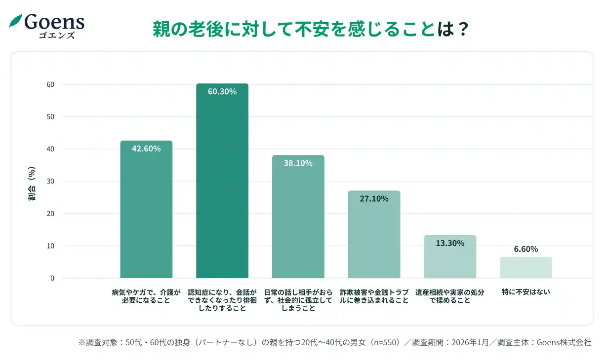 本調査から見えてきたのは、親の幸せを願いつつも、リスク管理を徹底したい子供世代のリアリズムでした。『Goens』は、こうした現代のニーズに応えるプラットフォームです。 |