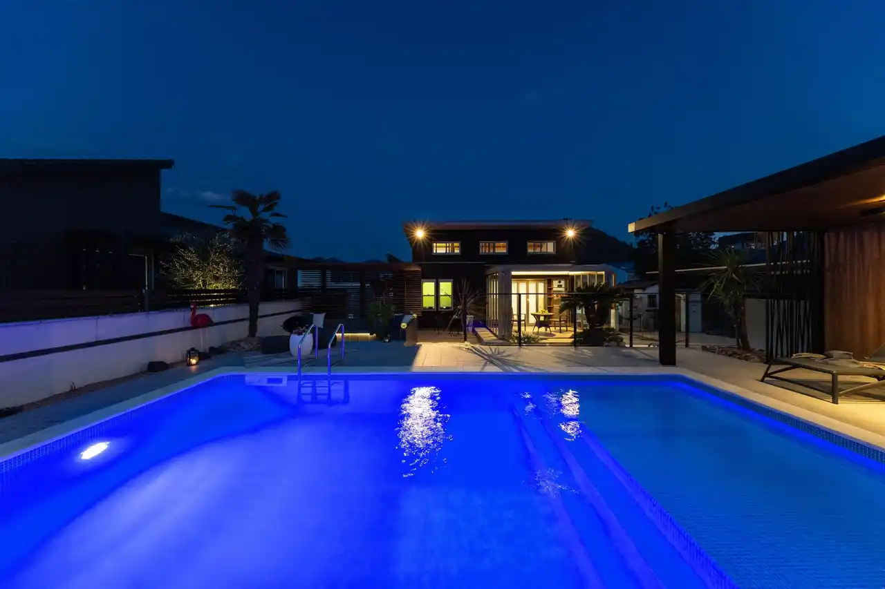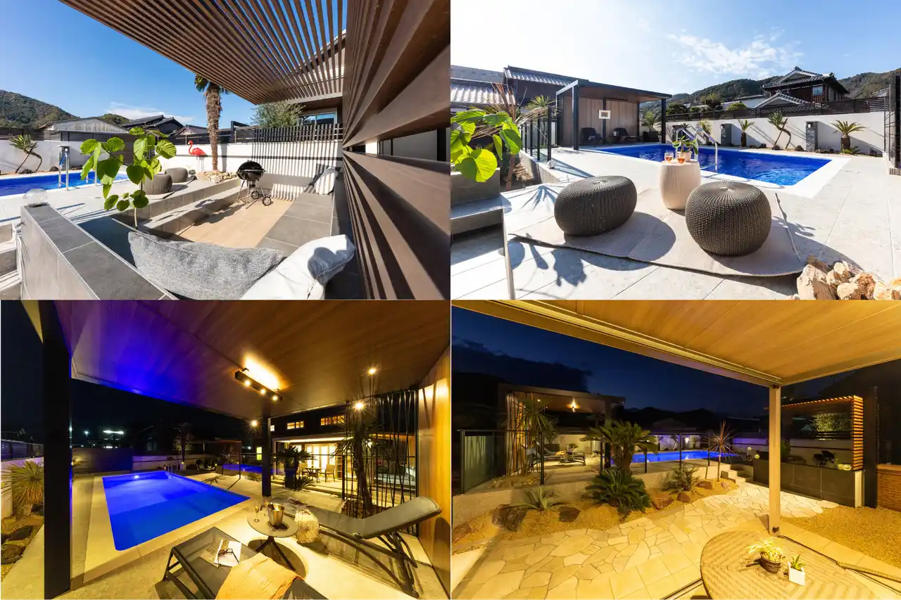 西脇市の展示場は、ペット連れでの見学を歓迎しています。施工後の生活をリアルにイメージできるよう、プール、アネックス(離れ)、ガーデンファニチャーまで含めたトータルコーディネートを展示。夜間のライトアップによる幻想的な演出も必見です。 |