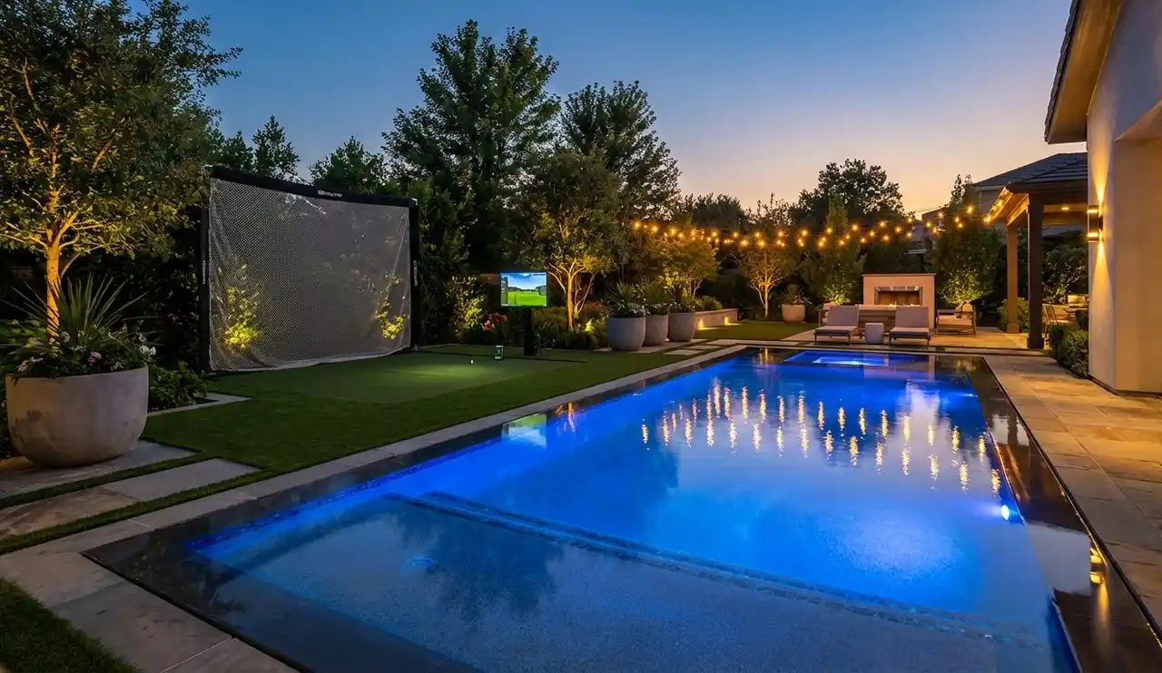 富裕層のライフスタイルに欠かせない「ゴルフ」を、水辺の癒やしと共に楽しむ贅沢。24時間、誰にも邪魔されないプライベート練習空間をプールサイドに構築します。水景デザインと融合した練習場は、単なる施設を超えた「煌めきの日常」を創出します。 |