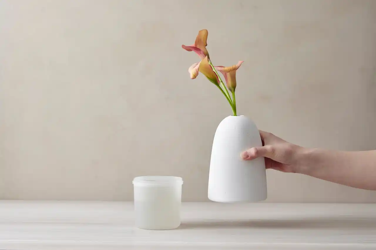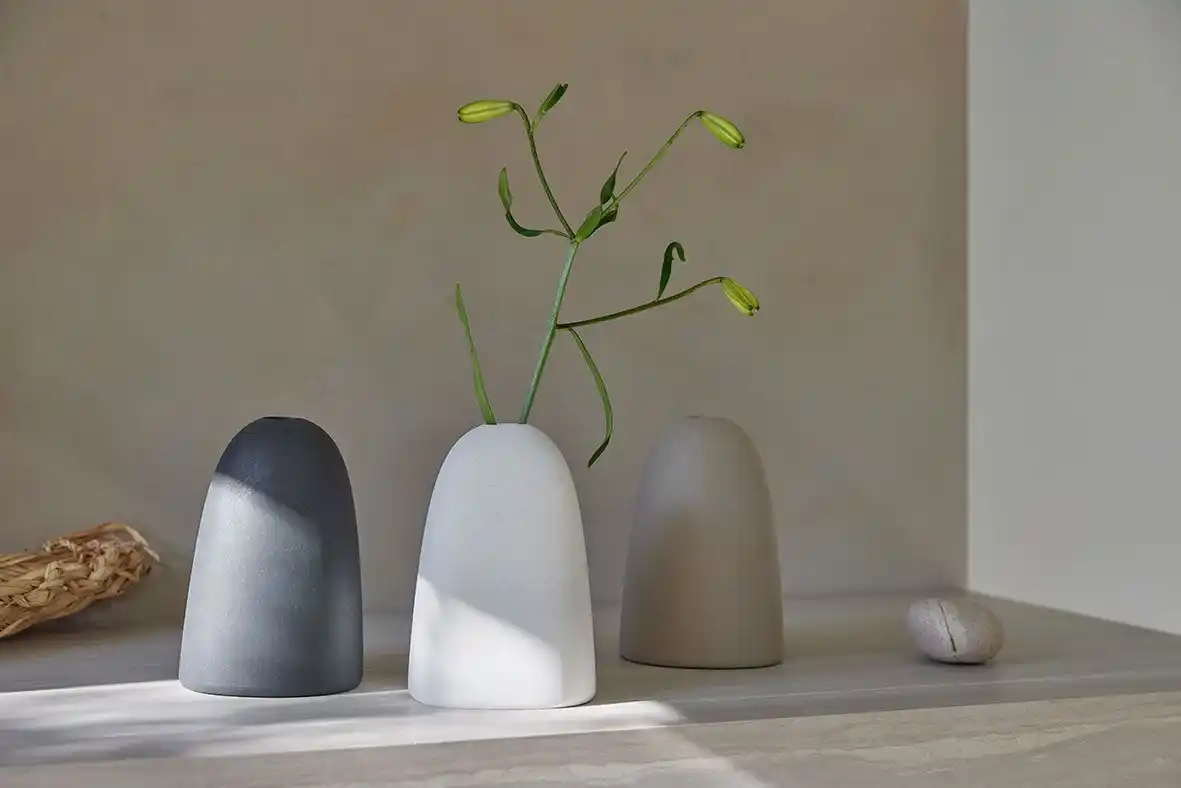 石のように穏やかな外観と、陶器を思わせるしっとりとした質感。緩やかなカーブを描くフォルムは、 主張しすぎずに花を引き立てます。和洋を問わずどんな空間にも自然と馴染み、置くだけで絵になる オブジェのような佇まい。ストレーナーにより、活け直さずに水替えができる細やかな工夫を施しました。 |