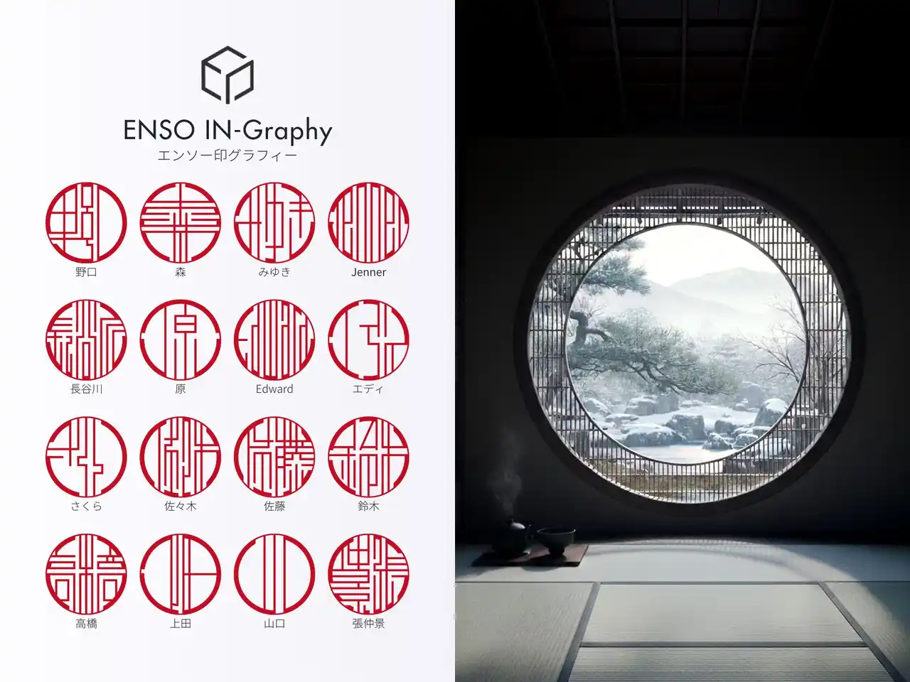 エンソー印グラフィーは、日本庭園を訪れた際に目にした円窓(えんそう)から着想を得て生まれたデザイン印鑑です。 |