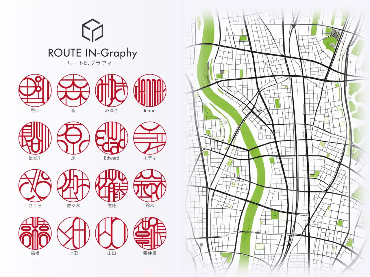 今回発表する「エンソー印グラフィー」と「ルート印グラフィー」は、その受賞で評価されたデザイン思想を土台にしながら、自然と都市、静と動という異なる風景の構造を名前の表現へと落とし込んだ新作です。 |