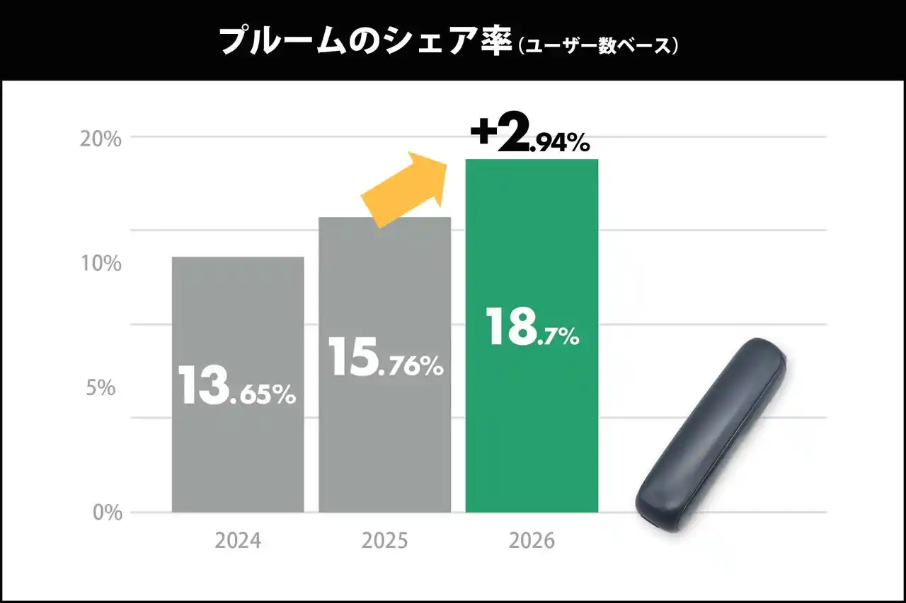 プルームは、2025年7月から投入されたコンパクトなデザインや機能性を改良した新型「Ploom AURA(プルーム・オーラ)」の好調や、積極的かつ地道なプロモーションにより、前年比+2.94%の伸びを見せ、過去最大のシェア率となりました。 |