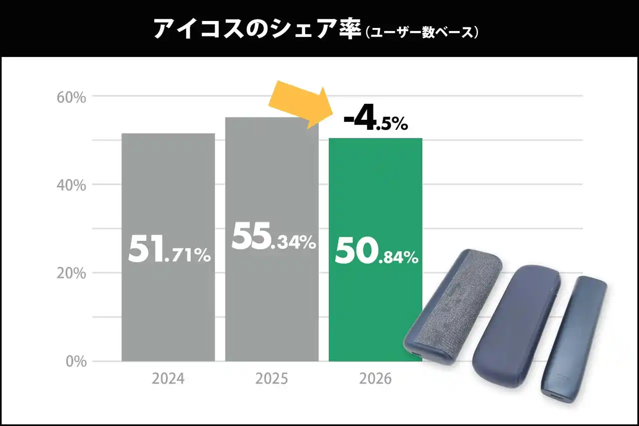 ■IQOS(アイコス):首位維持も、前年比4.54%減の50.84%へ |