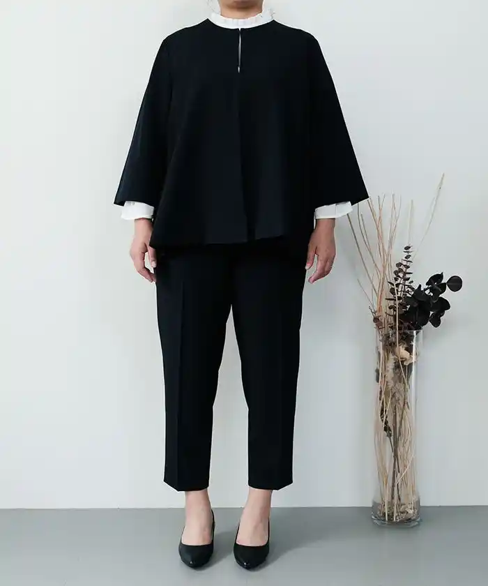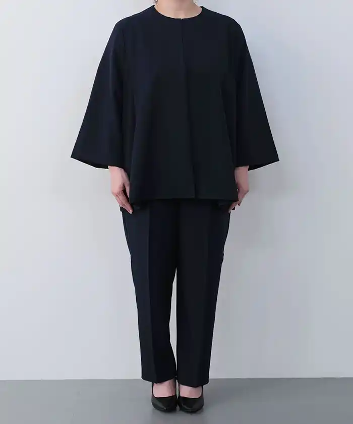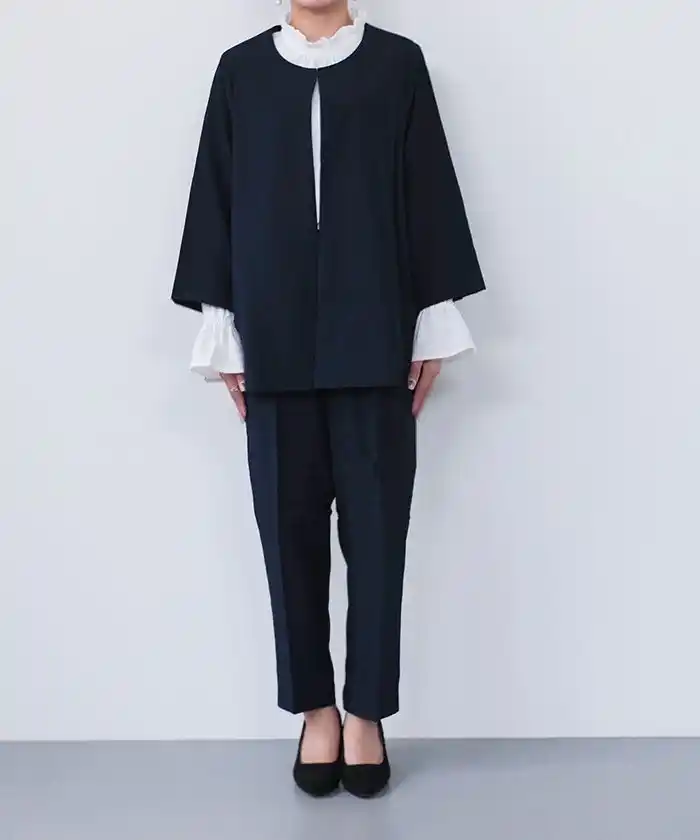 ジャケットはノーカラーで顔まわりをすっきり見せつつ、ふんわりとしたフレアシルエットが気になるお腹や腰回りを自然にカバーします。パンツはセンタープレス入りで脚長効果を実現しながらも、バックゴム仕様にすることでストレスフリーな履き心地を叶えました。長時間着用しても疲れにくく、大人の女性の装いを格上げします。 |