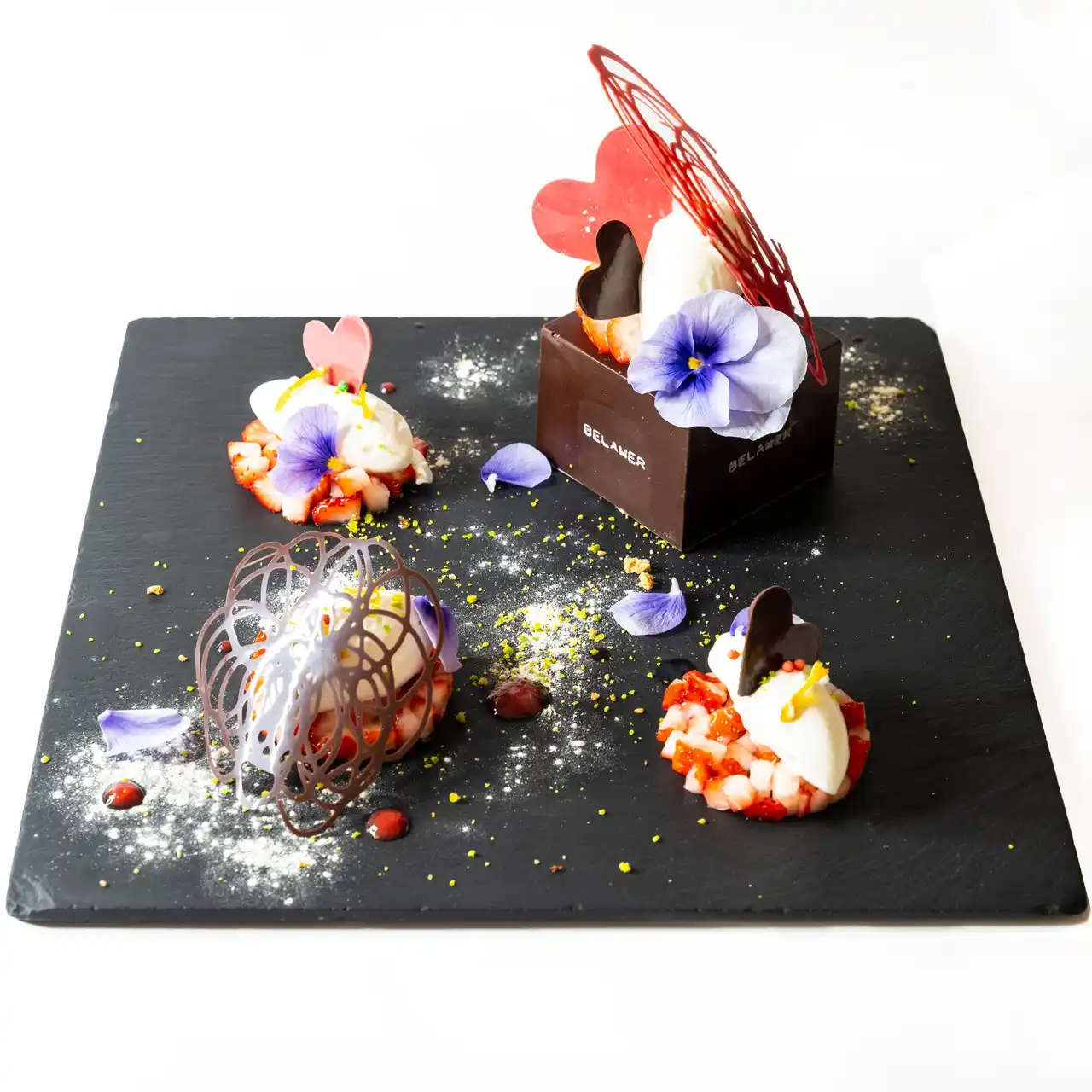 仕上げに、クリームチーズのアイスクリームとクリーム、 苺、ドライオレンジ、金平糖、ピスタチオ、 薄く仕立てたハート形のショコラを添え、 食感と香りが折り重なる一皿に。 |
