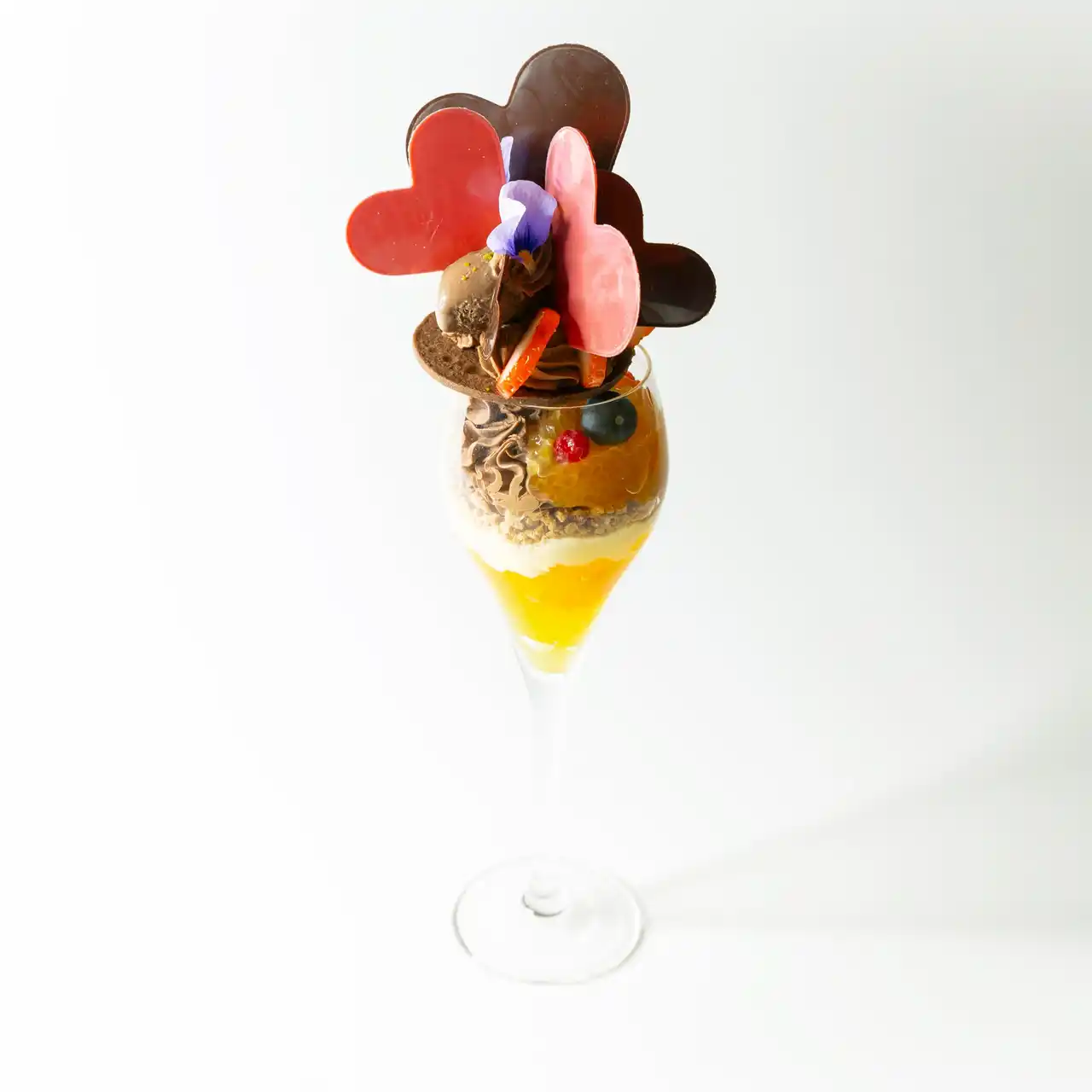 | バレンタインシーズン限定で登場する、苺と柑橘、そしてビターチョコレートが織りなす華やかなショコラパフェ。 | |||