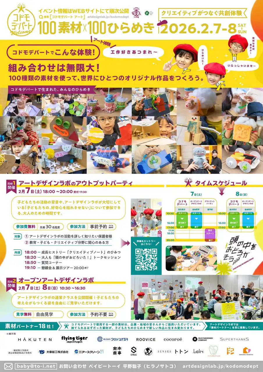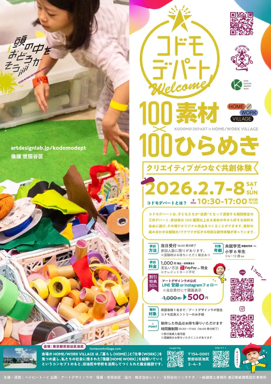 4歳からのクリエイティブスクール、アートデザインラボ(東京都世田谷区/運営:ベイビートーイ)は、体験型アートイベント「100素材×100ひらめき コドモデパート」を2026年2月7日(土)・8日(日)、HOME/WORK VILLAGE(世田谷区・池尻)にて開催します。 |