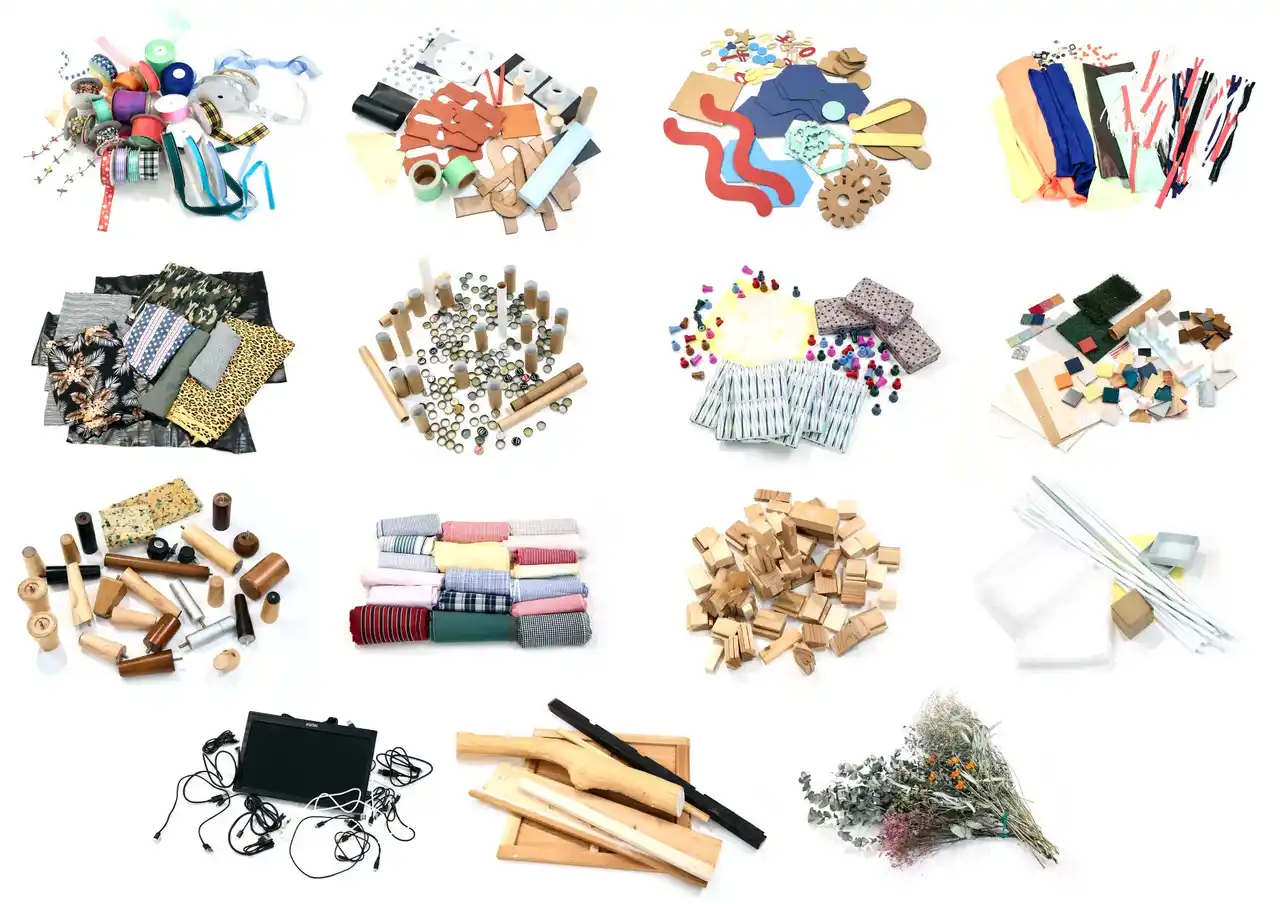 紙・布・木材・建材端材・文具・装飾素材など、企業・団体から届く「多様な100種類の素材」を通じて、子どもたちの創造力をひらく地域・企業・教育が連携するサステナブルな共創の場となります。 |